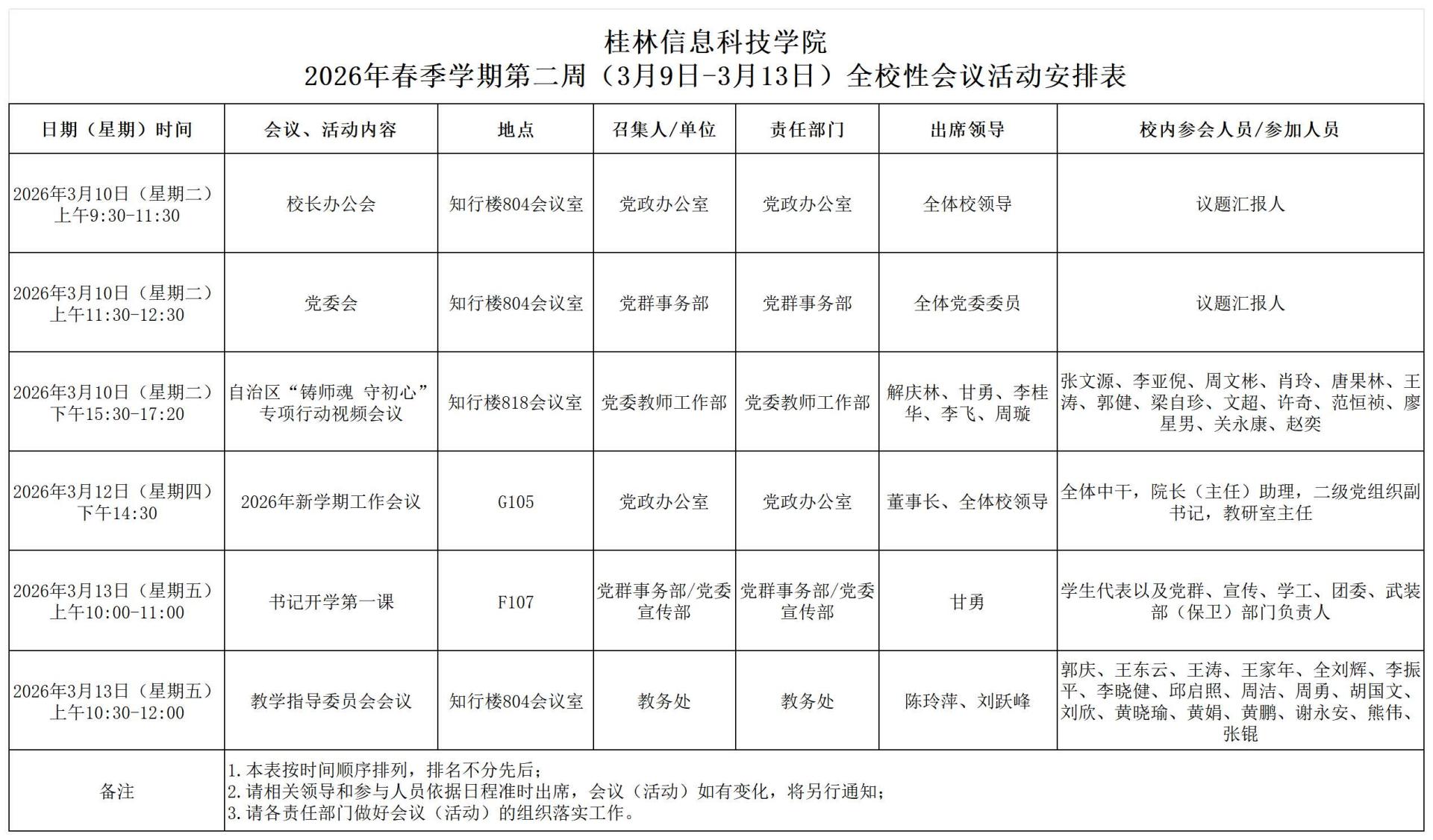 2026年春季学期第二周(3月9日-3月13日)全校性会议活动安排表