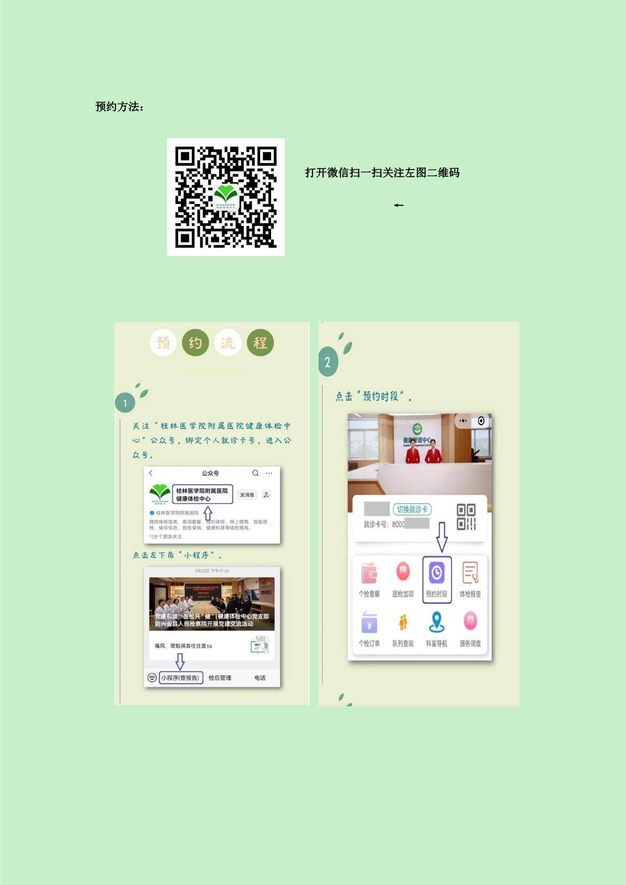 七、因故未能按时参加体检的教职工,可在10月28日前自行线上预约(预约流程附后)到桂林医学院附属医院体检中心进行补检,逾期按自动放弃处理。因涉及费用结算,请已领取体检单而未完成或不体检的教职工,在10月28日前把体检单交还到卫生所,谢谢配合!