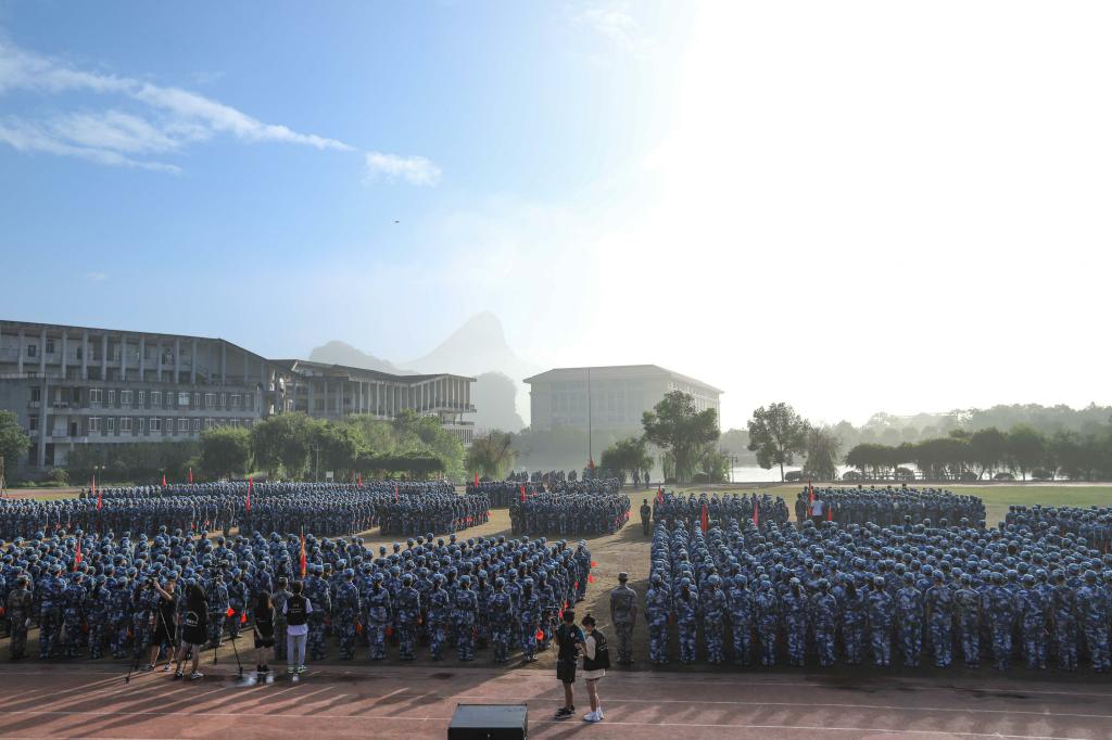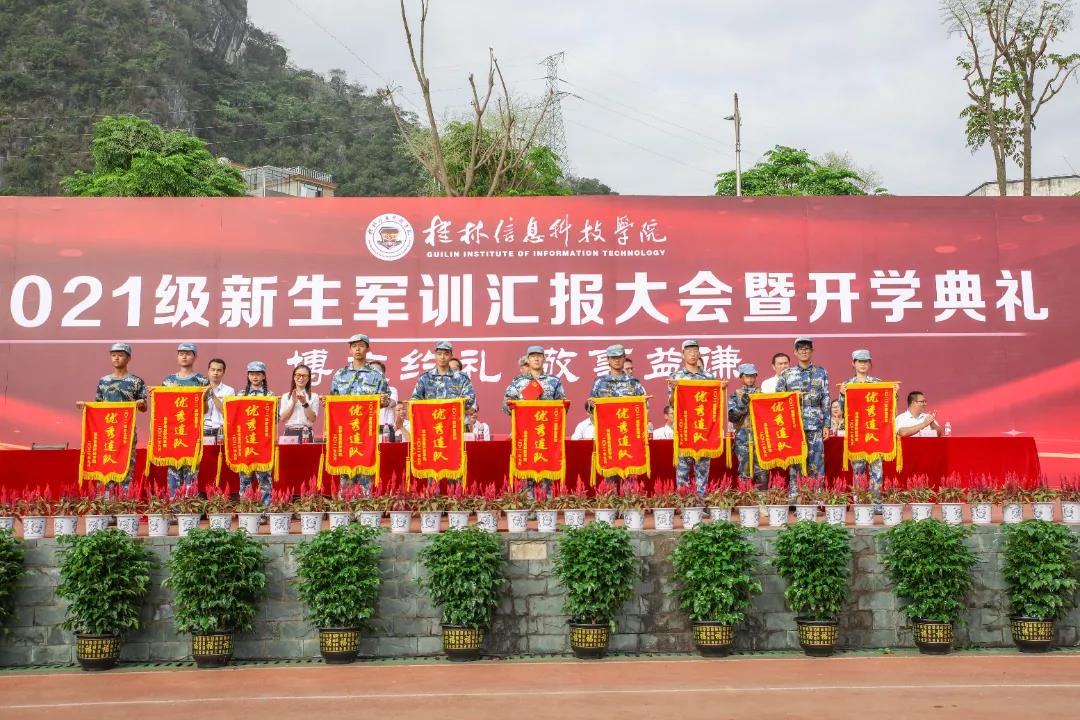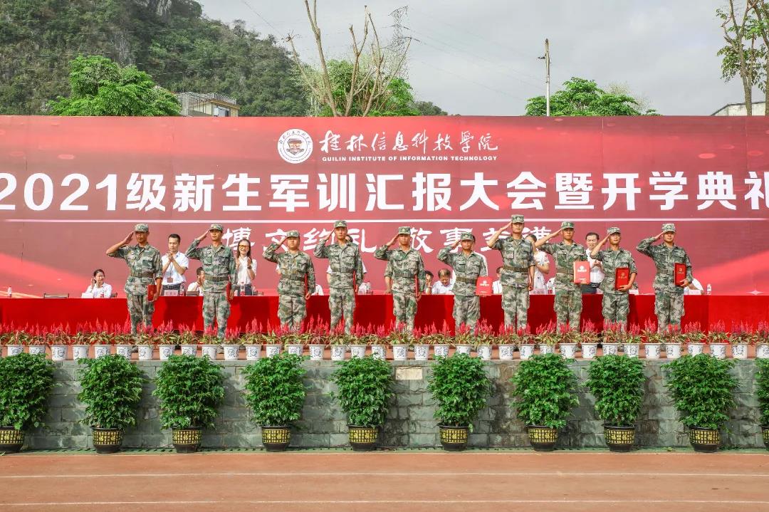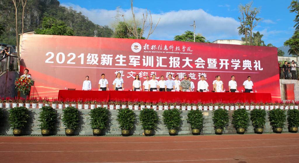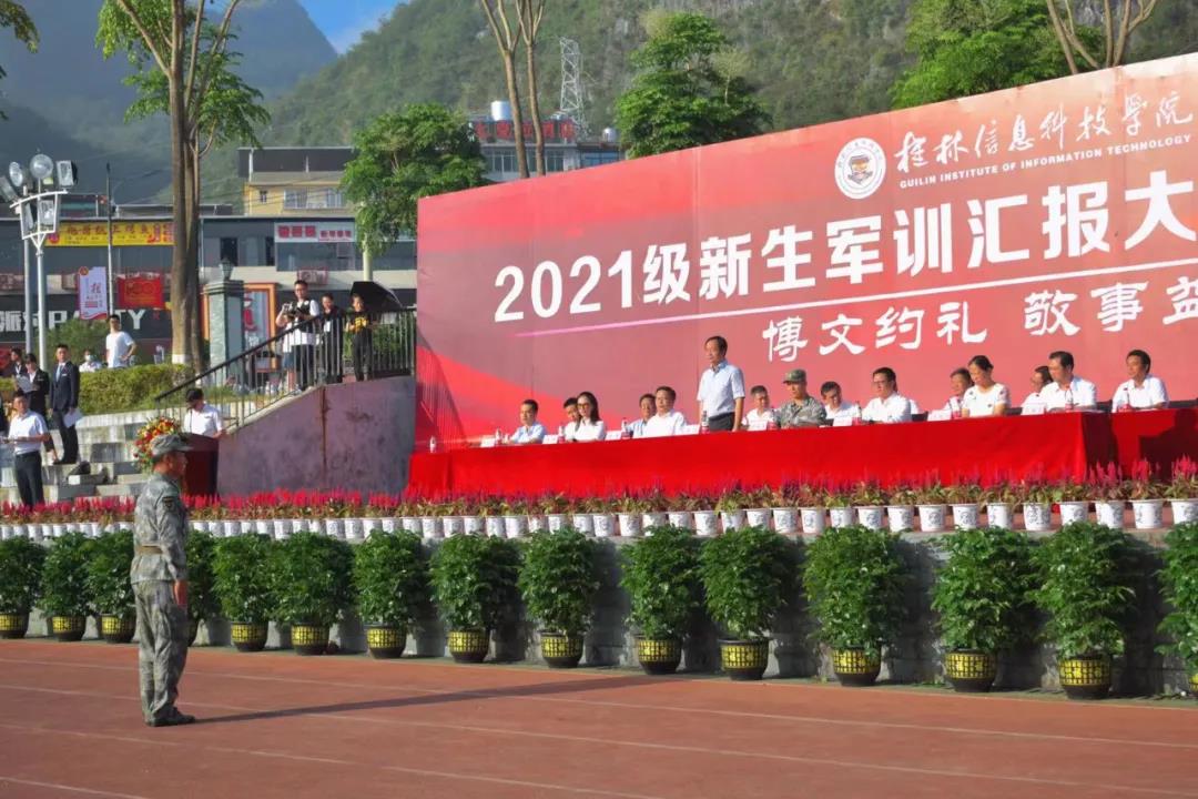 9月24日上午,pp电子在田径场隆重举行2021级新生军训汇报大会。桂林市灵川县人民武装部陈耀强中校,学校董事长罗欣、何学文主席,校长、党委书记甘勇,董事韦萍、黄晓玲,财务总监陈昱州、校长助理宋海军出席汇报表演大会。各部门主要负责人,新生辅导员、在校生代表及2021级新生参加大会。大会由学校副校长、党委副书记、纪委书记唐步洲主持。