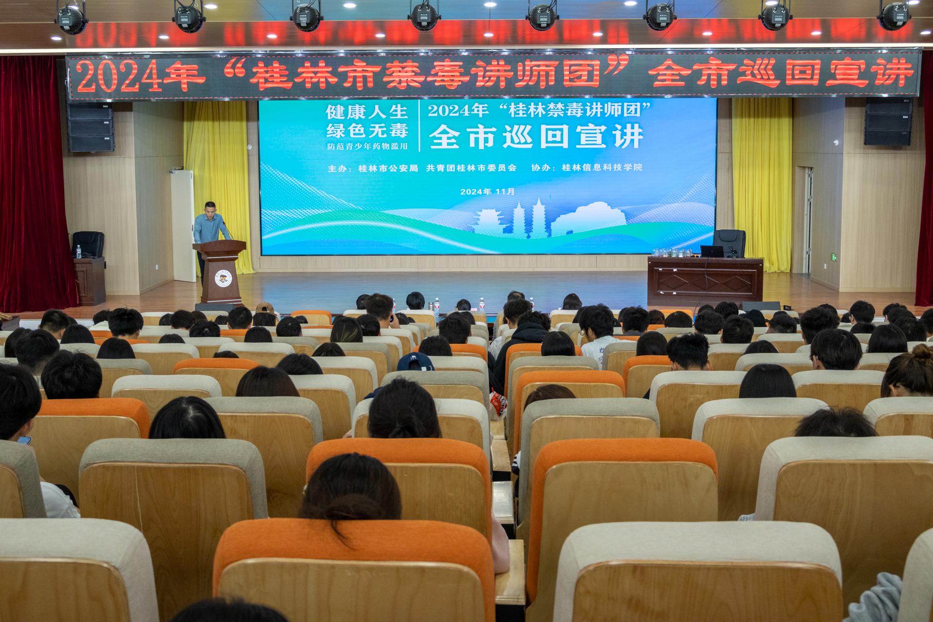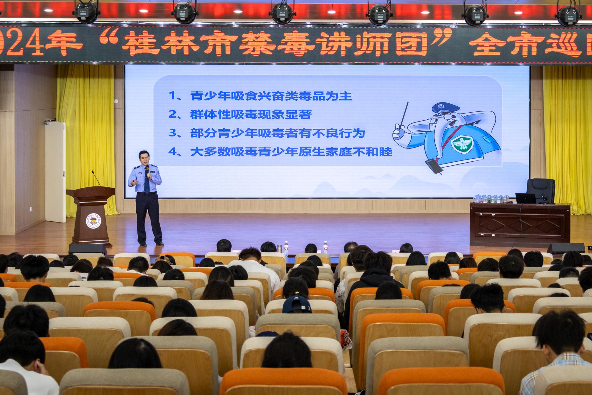 为深入学习贯彻习近平新时代中国特色社会主义思想、和习近平总书记关于禁毒工作的重要指示精神及关于广西工作论述的重要要求,深入贯彻落实国家禁毒委员会关于深入开展全民禁毒宣传教育工作方案,根据广西“清朗校园”专项行动方案,11月12日上午“桂林禁毒讲师团”全市巡回宣讲团来到pp电子模拟器网站,在F107报告厅开展pp电子模拟器网站专场禁毒宣讲活动。自治区禁毒办、公安厅禁毒总队情报处四级高级警长李迎春,市禁毒办副主任白伊霞,团市委权益部部长王卉,学校校长助理彭鹏,校团委书记周阳霖出席活动,学生代表近400人参加,活动由保卫处彭尧主持。