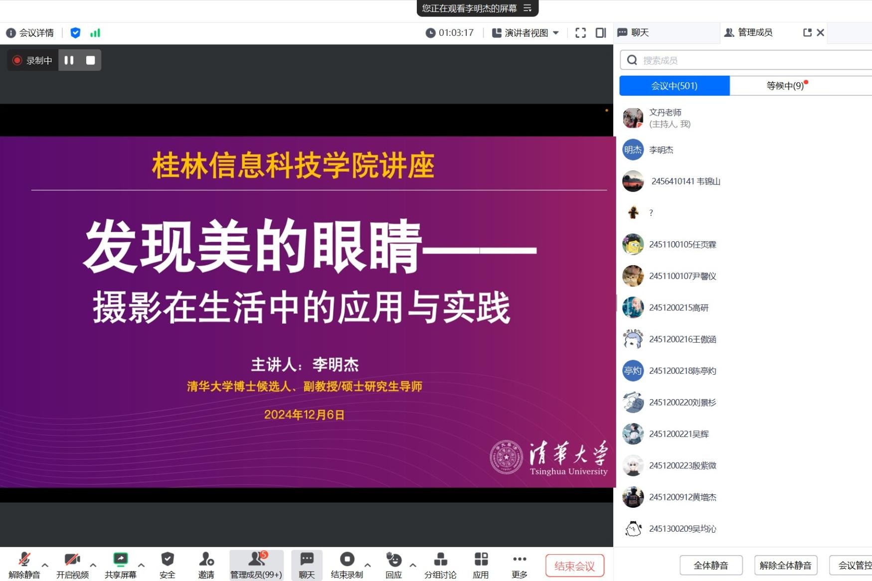 近日,创意设计学院举办了主题为“发现美的眼睛”摄影在生活中的应用与实践的美育专题讲座。此次讲座邀请了广西摄影家协会理事李明杰博士作为主讲嘉宾,为师生们带来了一场精彩纷呈的艺术盛宴。