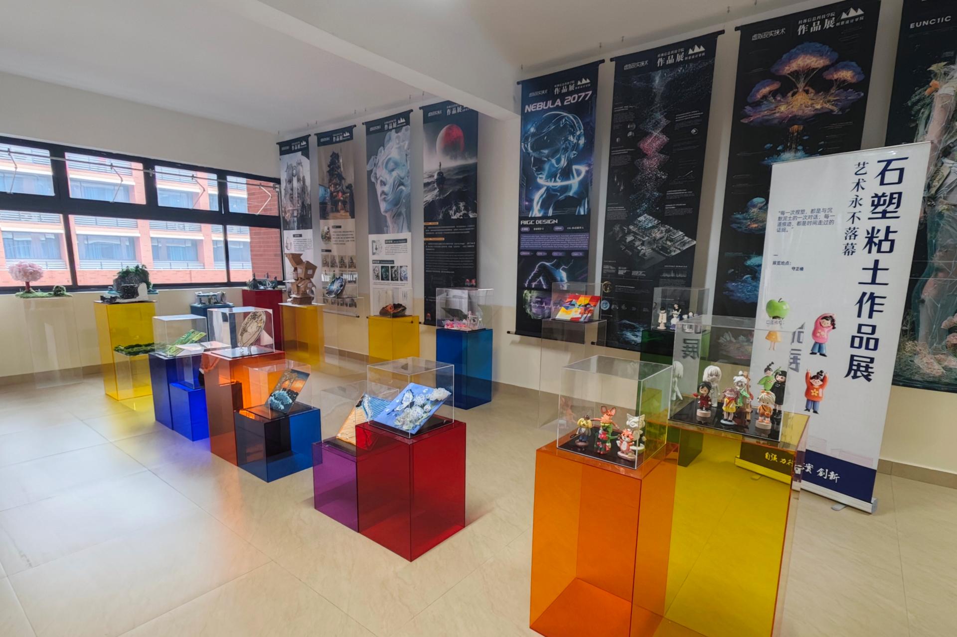 我院虚拟现实技术专业实训课程结课作品展于1月13日在守正楼三楼公共区域正式开展。本次展览汇集了大一、大二及专升本年级学生在《虚拟概念实训》《数字化视觉设计》和《三维场景实训》三门课程中完成的实体创作成果。