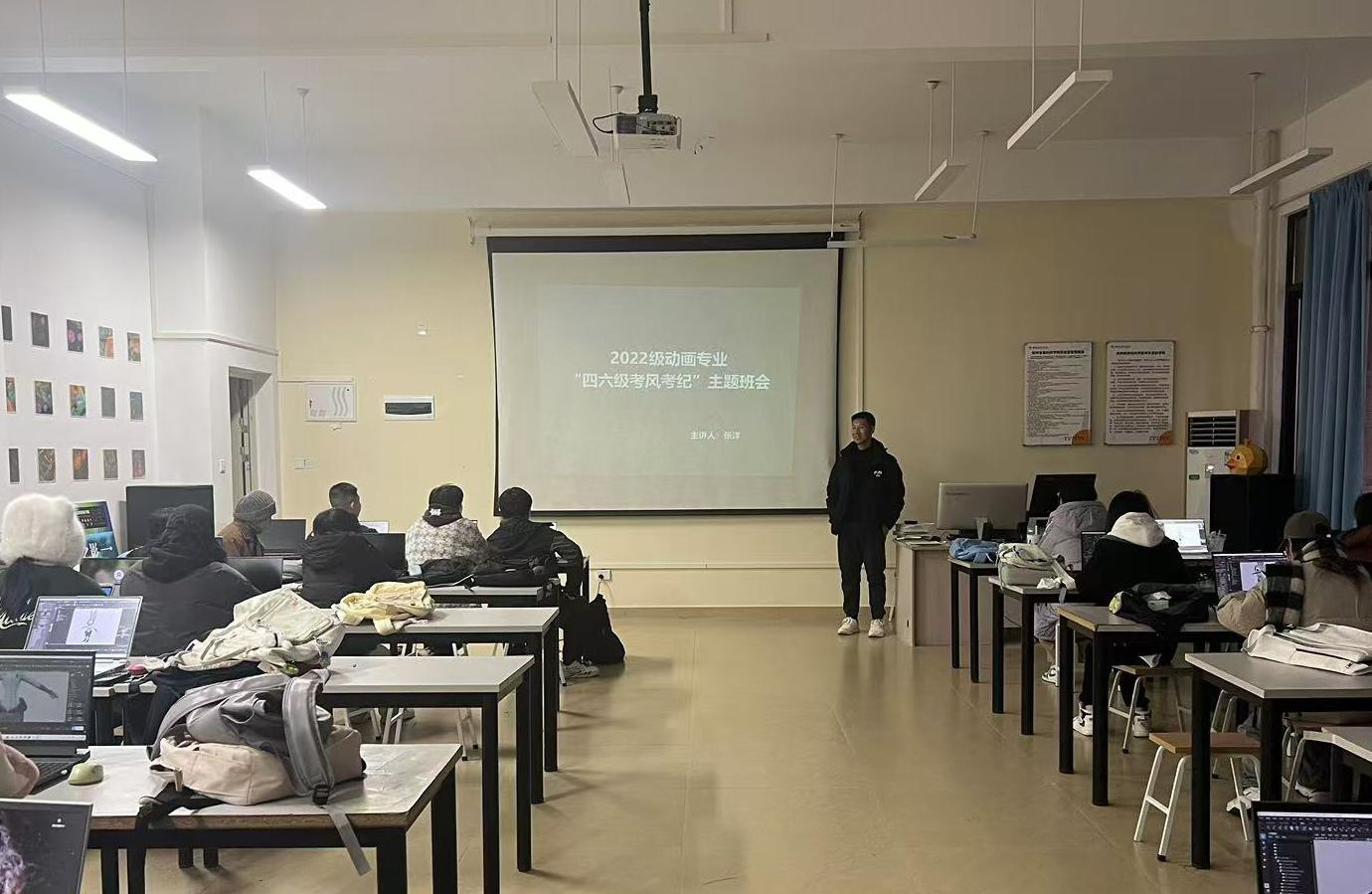12月12日,创意设计学院2022级动画专业1班在德远楼E402教室举行了“四六级考风考纪”主题班会。此次班会旨在加强同学们的考试纪律意识,营造良好的考试氛围,确保即将到来的英语四六级考试顺利进行。班会由张洋老师主持。