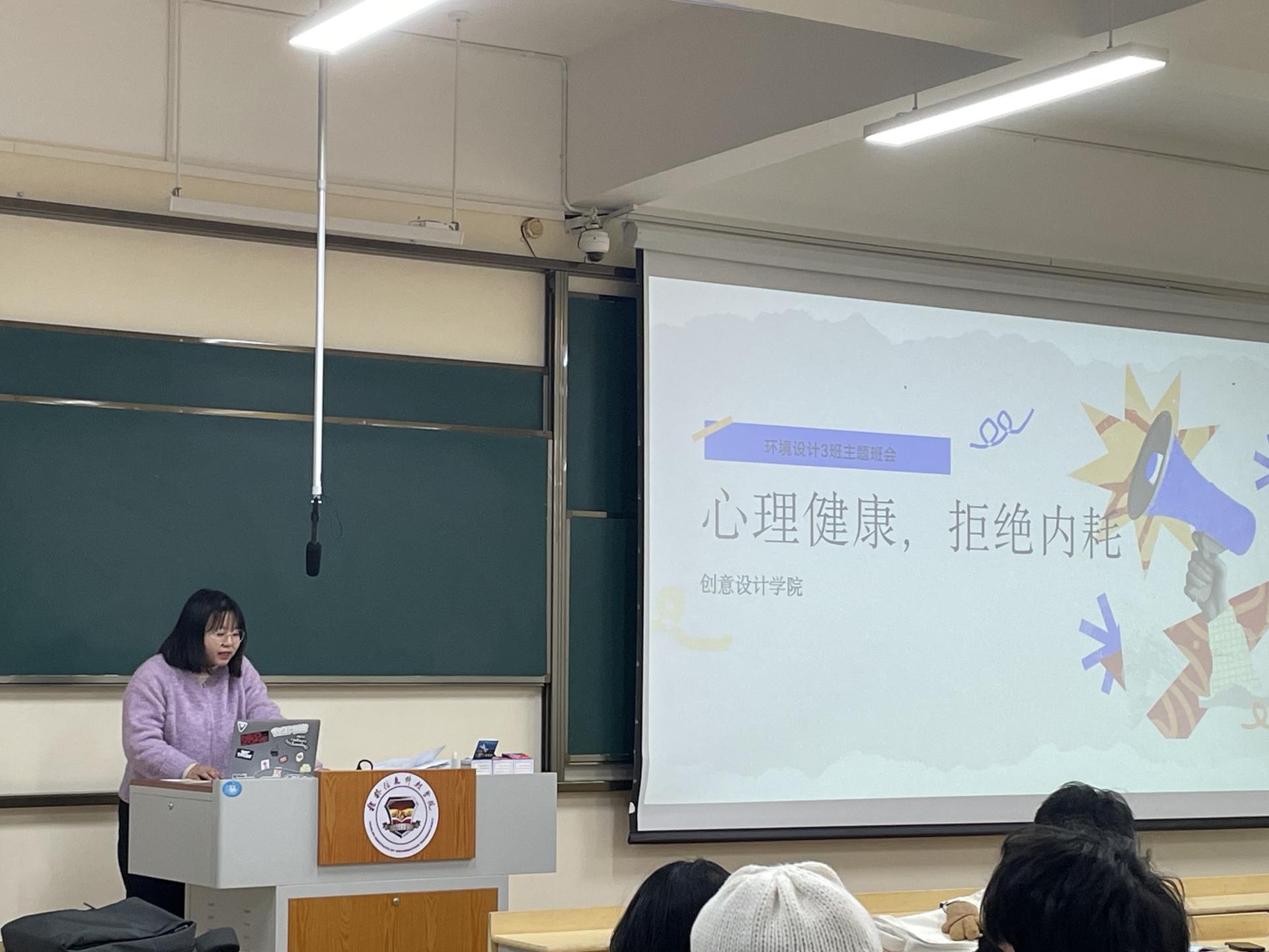 在快节奏的学习生活中,学生的心理健康状况日益受到关注。为了引导学生建立积极向上的心态,学会自我调节和管理情绪,促进身心健康成长,12月12日,2022级专升本环境设计3班在敏思楼D207特举办本次“心理健康,拒绝内耗”主题班会。本次班会由学业导师王欣乐老师主持,旨在让学生了解心理健康的重要性及基本概念,鼓励学生树立乐观、自信、坚韧的心理品质。