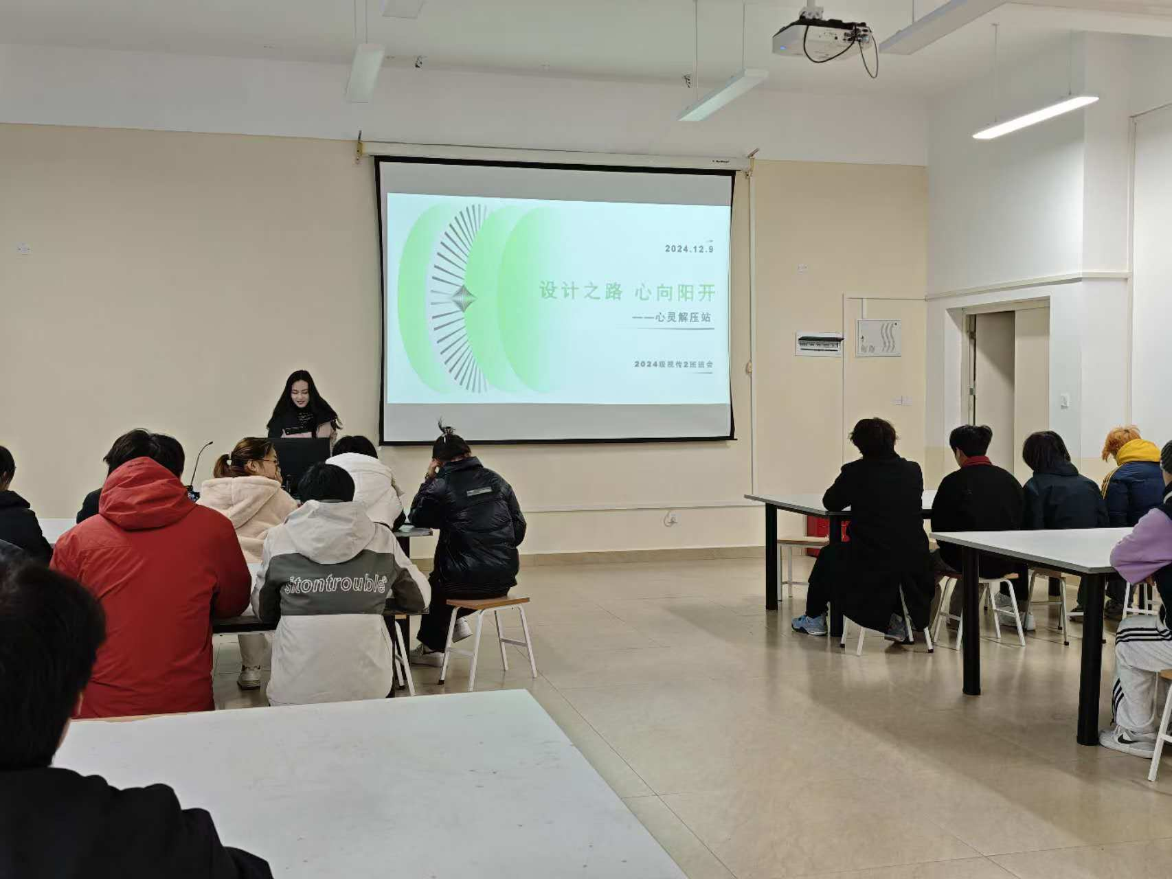 2024年12月9日,2024级视觉传达设计2班在德远楼E413教室成功举办了以“设计之路 心向阳开——心灵解压站”为主题的心理疏导班会。本次班会由班主任伍红霞老师主持,旨在帮助学生缓解学习压力,提升心理健康水平。
