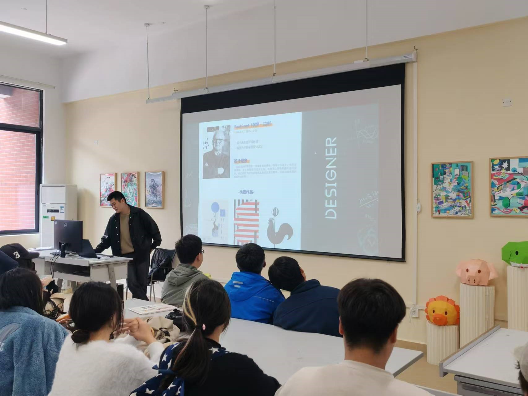 班会最后,耿老师结合自身及身边设计从业者的工作经历,向同学们展示了视觉传达设计师在社会上的职业发展方向和就业前景。通过一些视频内容的分享,展示了视觉传达设计师如何在不同的工作环境中发挥专业技能,以及如何在职场中定位自己,如何通过持续学习和实践提升自我。
