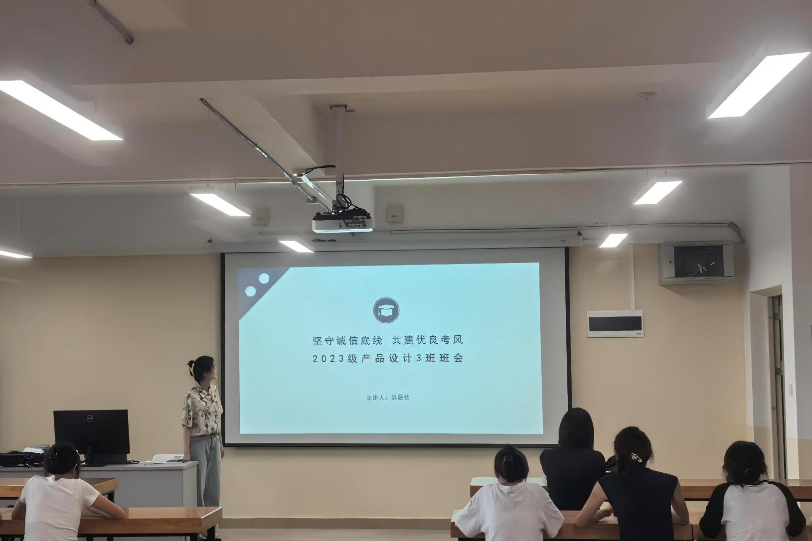 2025年6月16日下午,创意设计学院2023级产品设计3班于守正楼G411教室召开“坚守诚信底线,共建优良考风”主题班会。班主任吴辰怡老师主持会议,全体学生共同参与。班会聚焦期末考试关键时期,通过规则宣读、案例警示与互动讨论,系统加强学生对考试纪律的理解,为营造好的考试环境打下坚实基础。