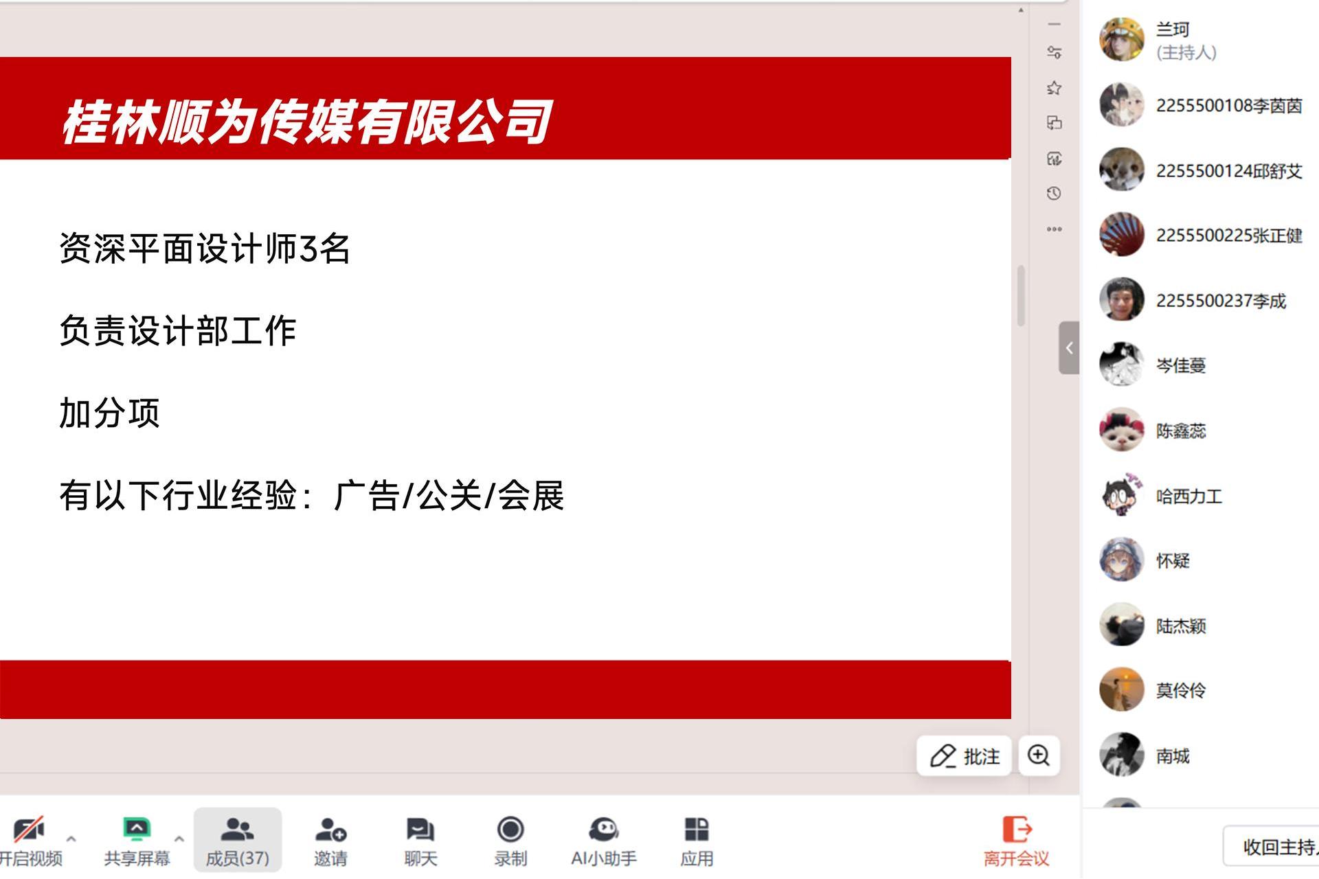 招聘会现场气氛热烈,顺为文化传媒的企业代表通过PPT 展示、现场讲解等方式,详细介绍了公司的发展历程、业务范围以及企业文化。公司作为桂林当地颇具影响力的文化传媒企业,在广告设计、品牌推广、数字内容创作等领域成果丰硕,其创新的设计理念和专业的服务态度赢得了广泛认可。针对本次招聘的平面设计师岗位,企业代表详细说明了岗位要求和职责。要求应聘者具备扎实的美术功底、熟练运用设计软件的能力以及良好的创意和审美能力,能够独立完成各类平面设计项目,如海报、宣传册、品牌标识等。