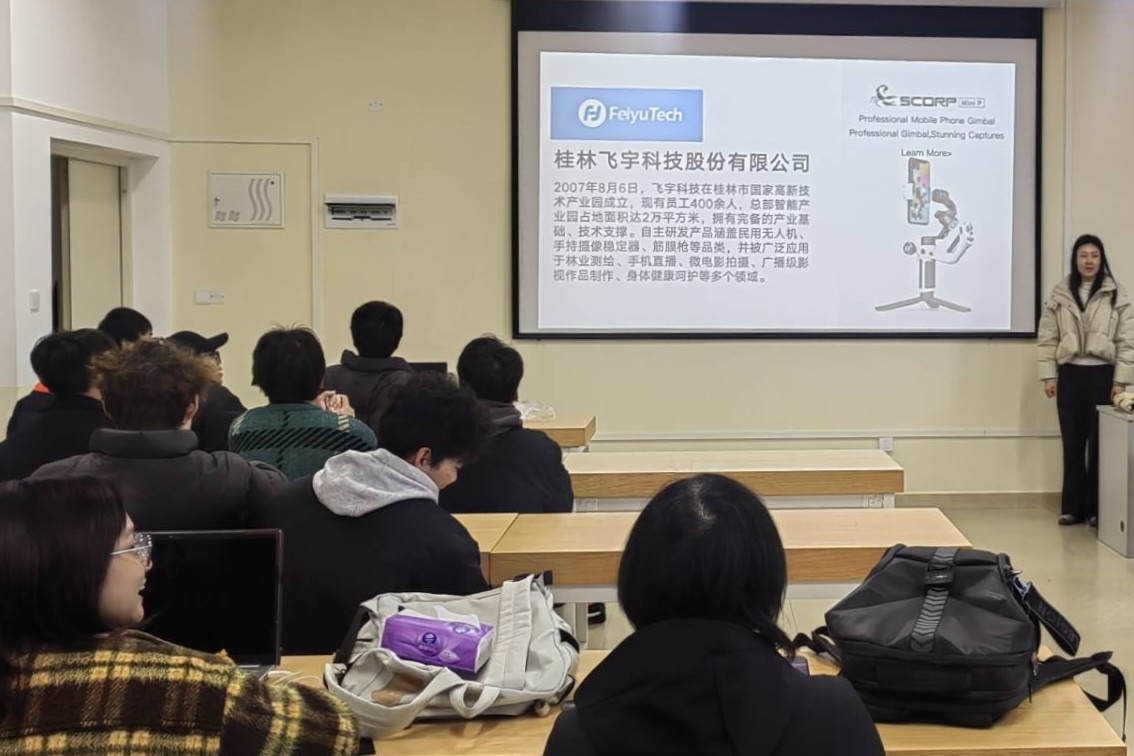 宣讲会伊始,宣讲老师对桂林飞宇科技股份有限公司介绍了公司的业务范围、企业文化、发展前景及人才招聘政策,阐述了公司在无人机、稳定器及筋膜枪等领域的研发成果和市场应用,展示了飞宇科技在技术创新和市场拓展方面的强大实力,提到了公司在数字媒体领域的多项创新技术。在宣讲会互动环节,学生们积极提问,围绕招聘需求、个人职业规划等问题进行了交流。