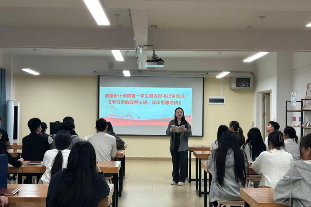 为深入学习贯彻党的民族宗教工作方针政策,引导支部党员准确把握我国宗教法律法规的核心要义,全面提升政治鉴别力与思想免疫力,12月5日,创意设计学院第一学生党支部在守正楼G411教室举办支部书记讲党课活动。党支部书记周金悦以“学习宗教政策法规,筑牢思想防线”为主题,为支部全体党员生动讲授专题党课。