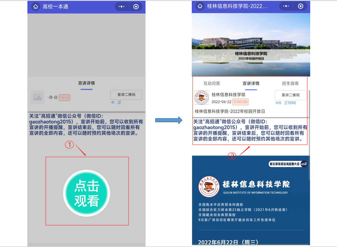 2、高招通微信直播平台,扫描下面图片二维码即可进入观看直播,直播时可留言互动。