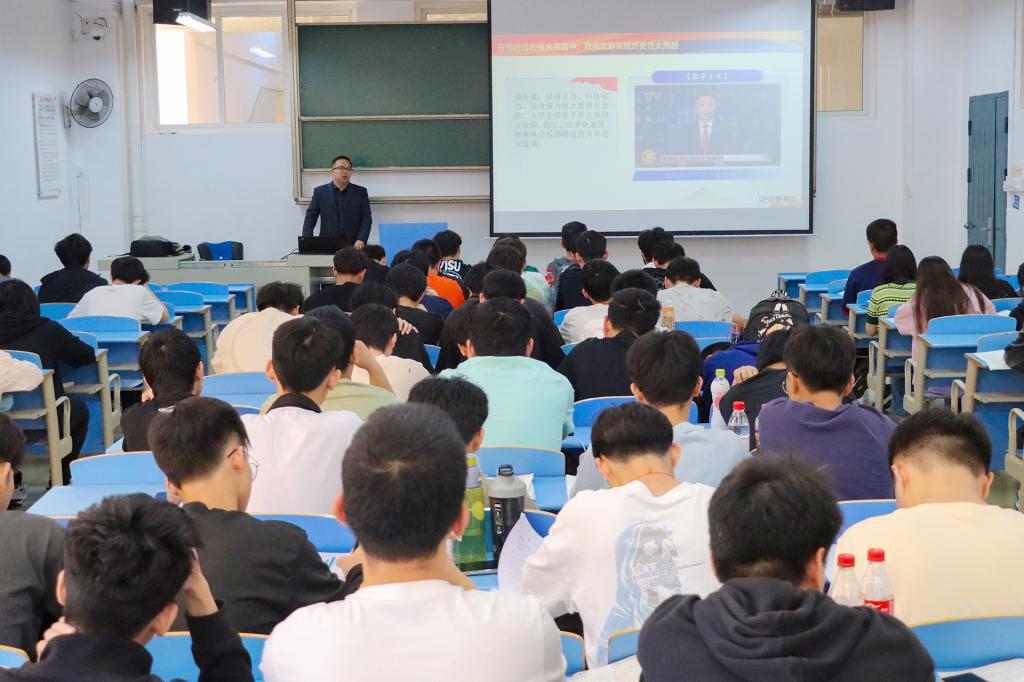 4月26日,学校党委书记甘勇在22104教室为通信工程专业大一学生讲授形势与政策课。