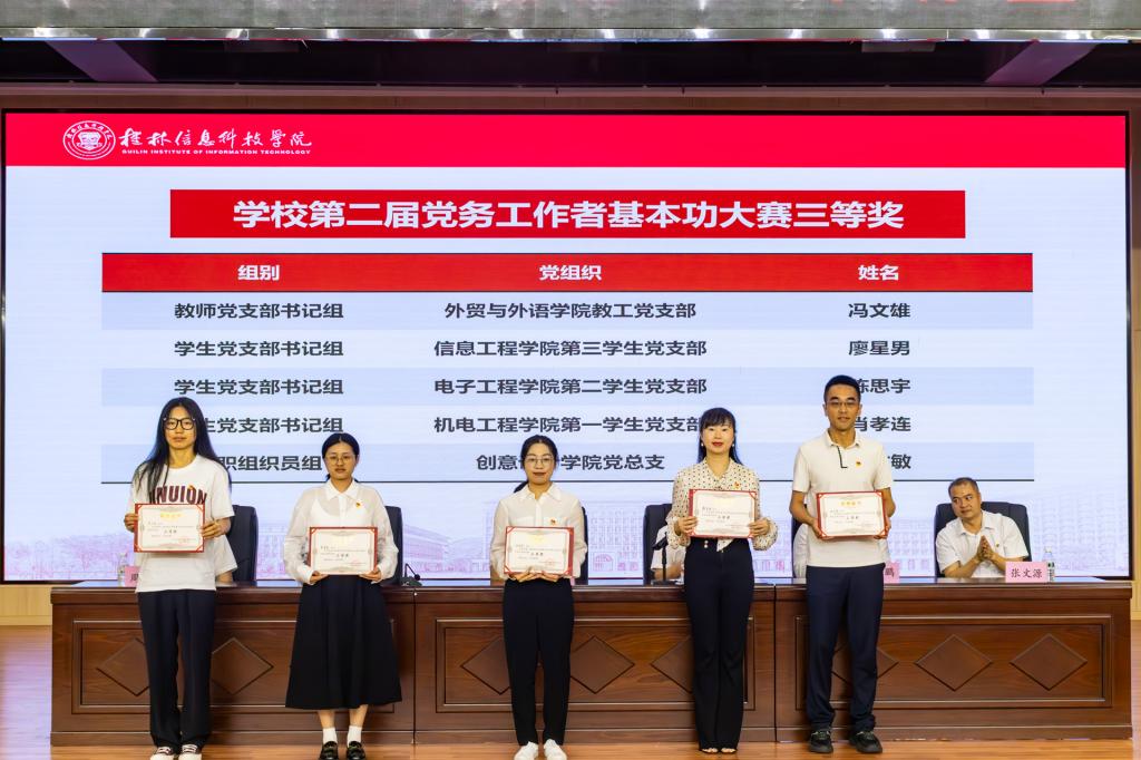 本次大赛设专职组织员、教师党支部书记、学生党支部书记三个组别,分为基础知识测试、微党课展示、党建工作案例展示三个环节,共有34名学校党务工作者参赛,重点考察了党务工作者的理论素养和业务技能。经过紧张比赛和激烈角逐,评出一等奖3名、二等奖4名、三等奖5名。其中,剌啸媛、谷鑫钰、吕丽等3名同志荣获一等奖;谢如欢、赵玉婷、邓寿任、雷欣等4名同志荣获二等奖;冯文雄、廖星男、陈思宇、肖孝连、李文敏等5名同志荣获三等奖。学校党委对取得优异成绩的党务工作者进行了表彰,将根据比赛结果遴选出优秀参赛者代表学校参加第二届广西高校党务工作者基本功大赛。