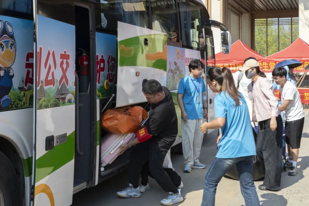 正午时分,烈日当空。党员志愿者们仍推着满载行李的推车,穿梭于接驳点和接驳车之间。