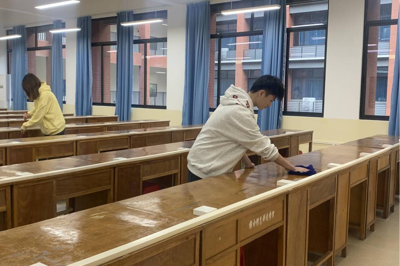 活动当天,志愿者们分成10个小组,对敦明楼20间实验室展开全面清洁。各小组分工明确,配合默契,重点对实验台面、仪器设备、地面及卫生死角进行彻底清理。在劳动过程中,师生们发扬不怕苦、不怕累的精神,认真擦拭每一台仪器,整理每一件实验器材,确保实验室环境整洁有序。经过两个多小时的辛勤劳动,实验室焕然一新,为师生创造了更加舒适安全的教学科研环境。