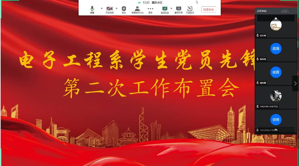 7月16日晚8点,电子工程系学生党员先锋队在腾讯会议室召开线上工作布置会。会议由学生党员先锋队队长宋超主持,先锋队全体委员参加会议。