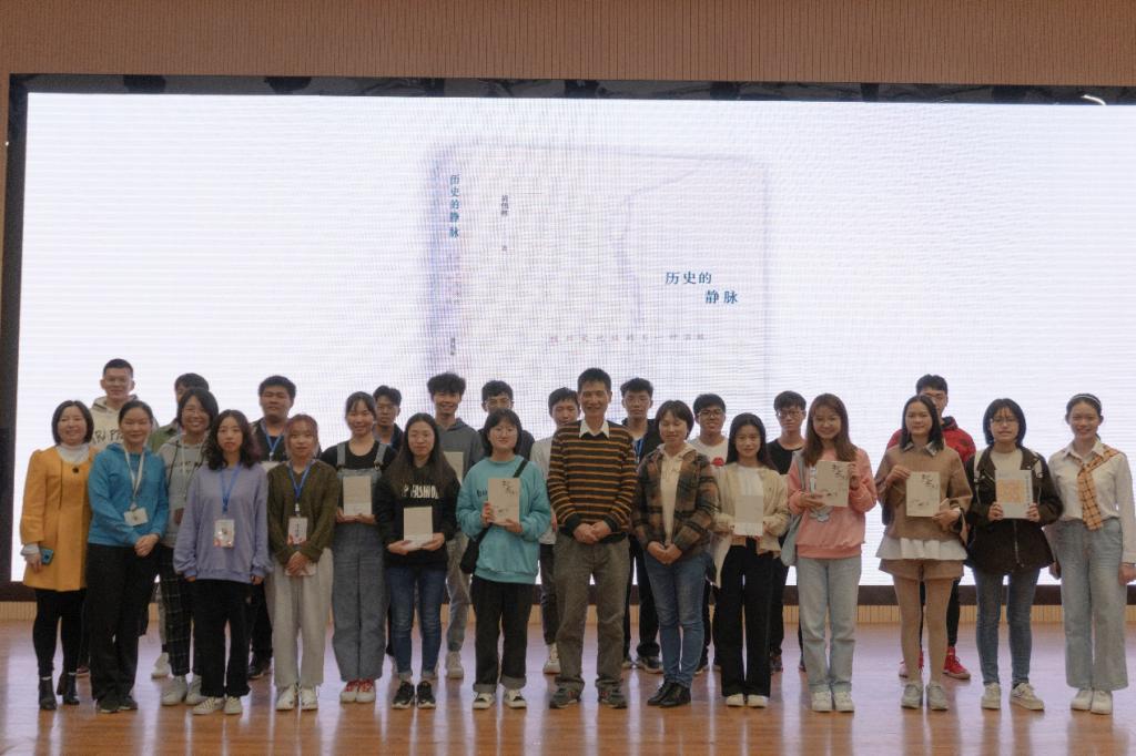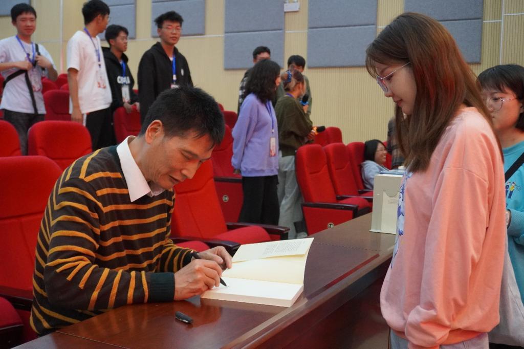 会上,黄伟林教授给我们讲解了桂林的历史,特别讲到桂林的山水与古城墙。其中着重讲到独秀峰,说到峰上的石雕“南天一柱”,既是形容独秀峰挺拔于天地间,也暗喻了广西人民的独立自强。期间黄教授还给师生们观看了由其本人指导改编的舞台剧,会后黄教授对新书进行了签售。