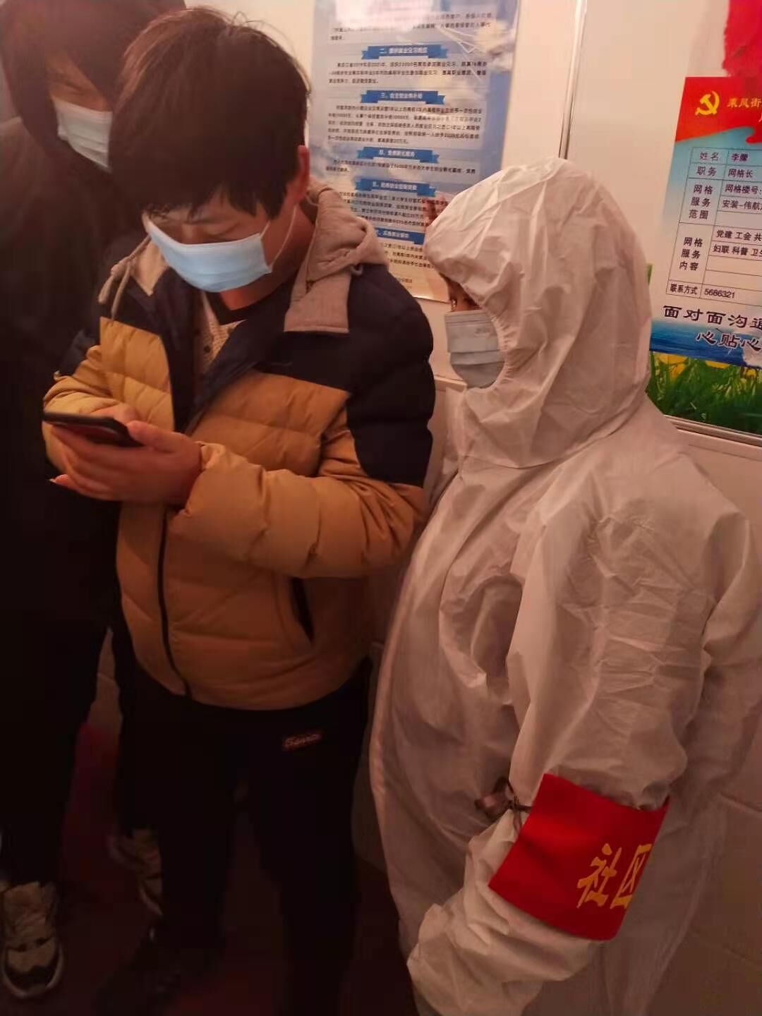 2020级电科二班浦莹在黑龙江省大庆市让胡路区乘风一社区协助社区人员扫码测温,在大庆市进行全员测温时帮助市民下载支付宝并建立核酸检测码。