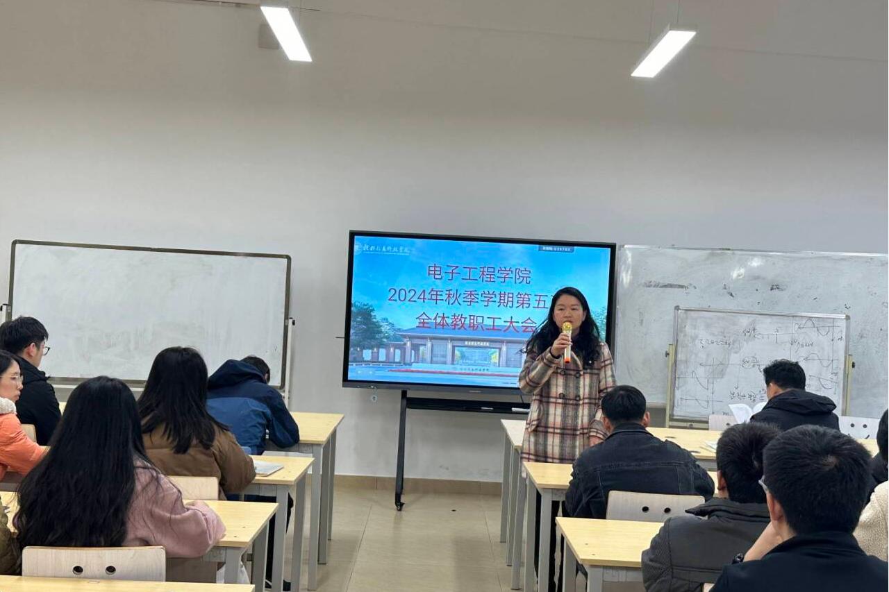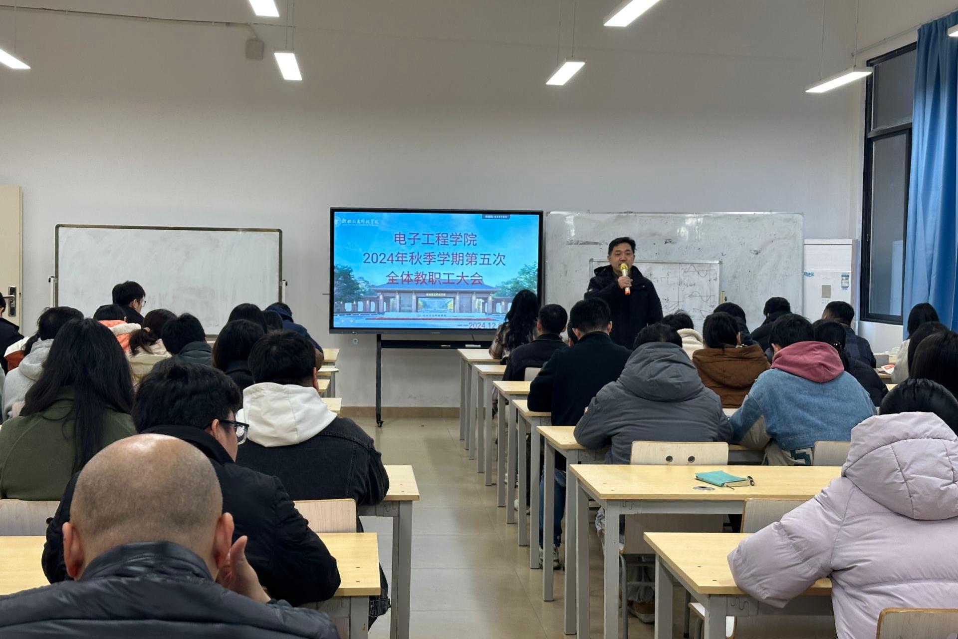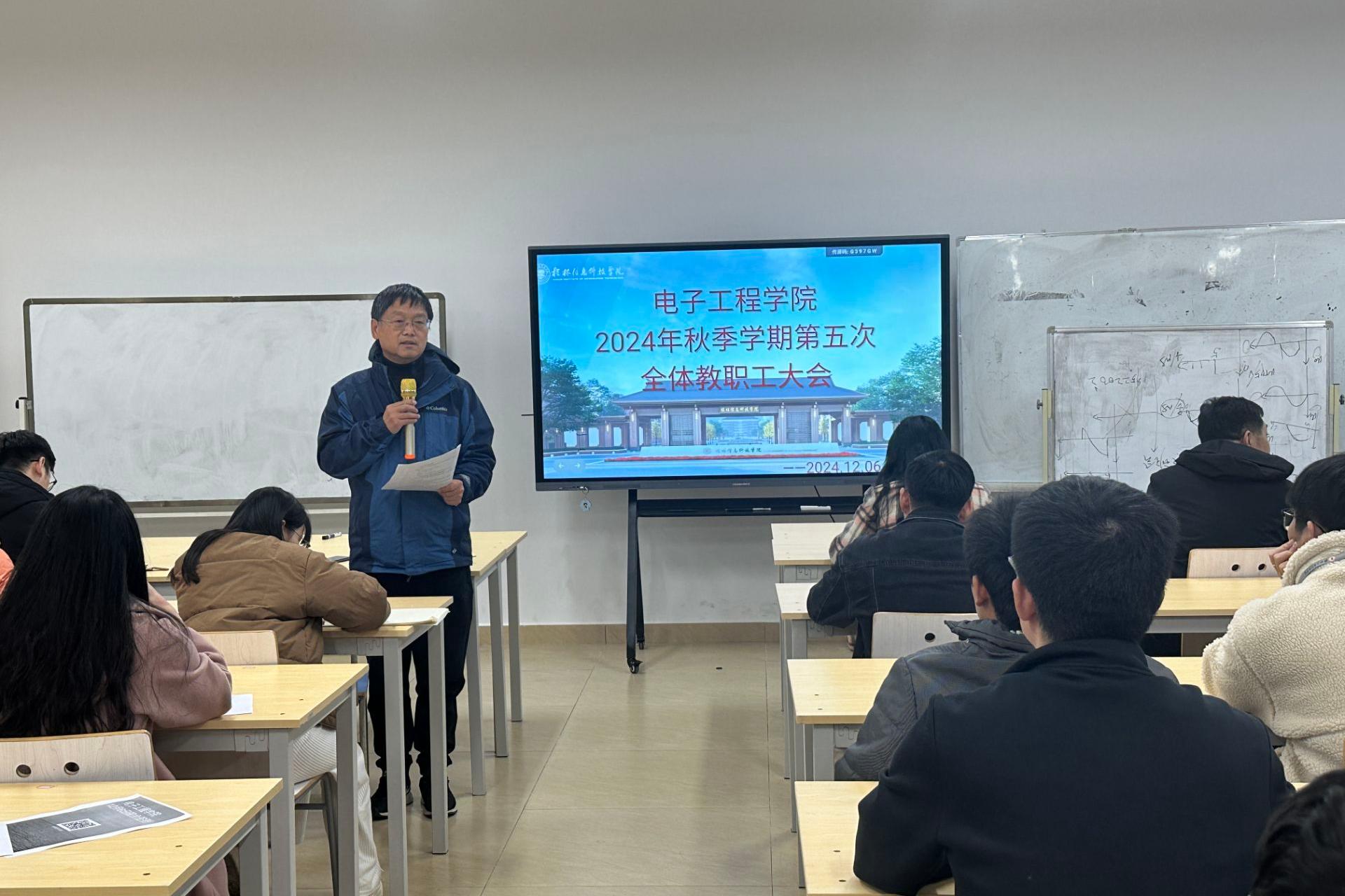 近日,电子工程学院在A504召开了2024年秋季学期第五次全体教职工大会,本次会议由党委书记梁自珍主持,院长王东云,副院长赵志鹏,院长助理梁晓梅、王涛出席,全体教职工参与。