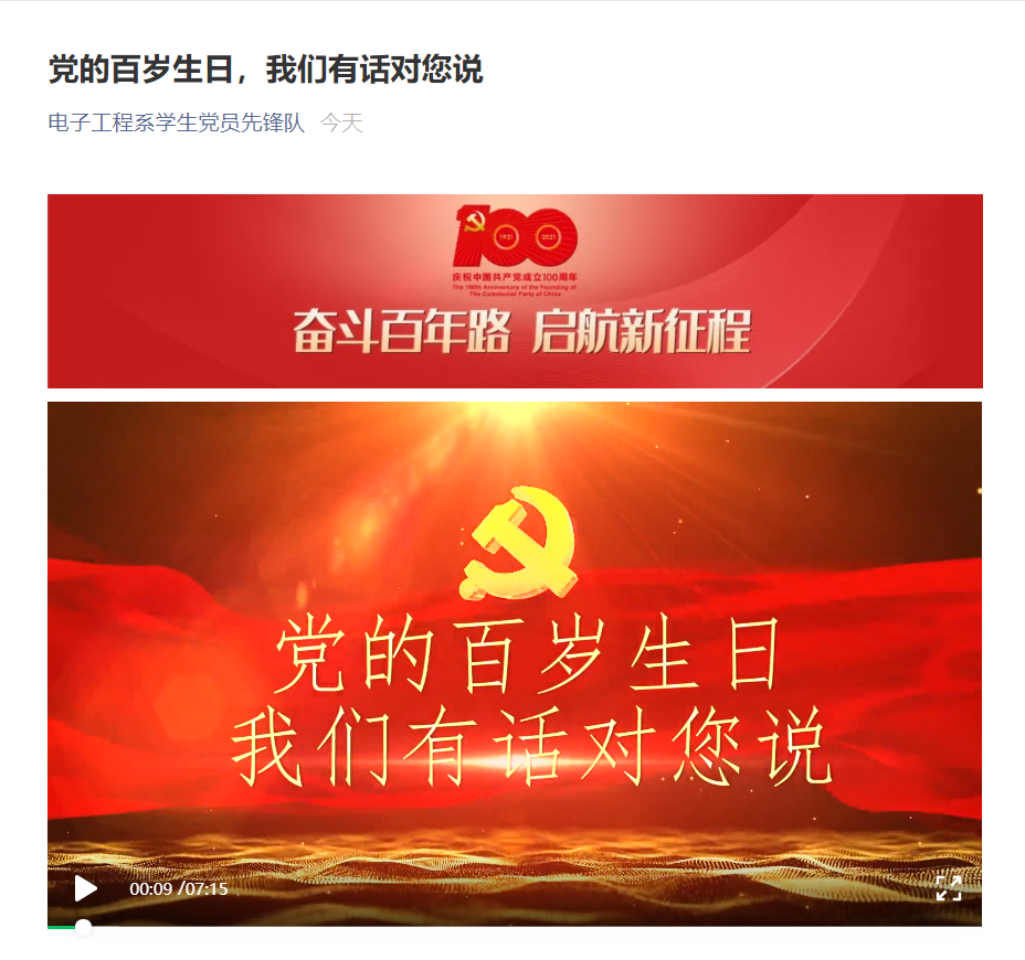 为庆祝中国共产党成立100周年,连日来,电子工程系党员先锋队结合“七一”组织全体委员开展用祝福献给党等丰富多彩的庆祝活动,激励引导广大党员坚定理想信念、永葆党员本色、立足本职岗位,以崭新的风貌、饱满的热情、扎实的作风,向建党100周年献礼。