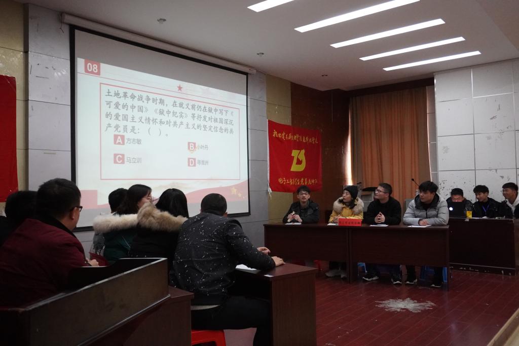 为加强学生党员思想理论建设、加深对四史的了解与学习,12月4日中午,电子工程系党员先锋队在21201报告厅举办“学四史,守初心”主题知识竞赛。学院党群事务部老师蒋春妹,系专职组织员陈义红,先锋队指导老师池锴及各学生党支部书记出席活动。