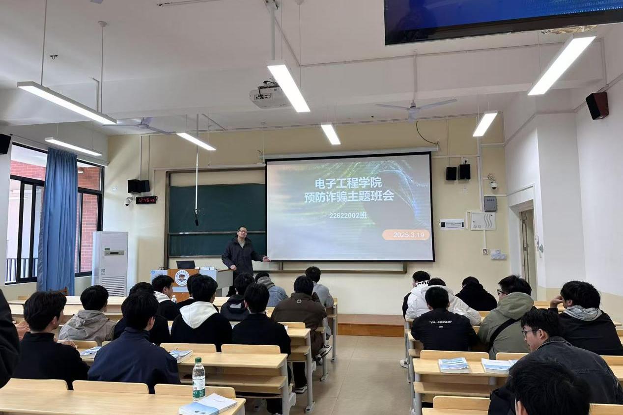 近日,为提高同学们的防诈骗意识,电子工程学院于敦明楼A514举办了以“预防诈骗、警钟长鸣”为主题的班会。本次班会活动邀请了各班班主任为同学们讲解当前诈骗的常见手段及预防措施。