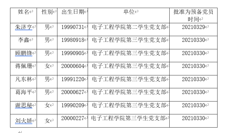 经党组织一年以上的培养教育和考察,朱济亨等8位同志预备党员预备期满,各党支部拟在近期召开党员大会讨论几位同志转正问题。为了进一步增强发展党员工作的透明度,严格发展党员工作程序,防止不正之风,确保发展新党员的质量,现将预备期满的预备党员名单公示如下: