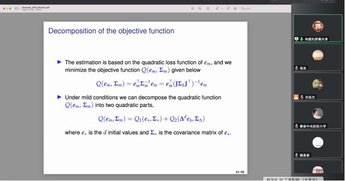 2022年4月27日,对外经济贸易大学国际经济贸易学院副教授林蔚应yl23455永利官网邀请,开展主题为“Seasonal adjustment of time series observed at mixed frequencies using singular value decomposition with wavelet thresholding”的讲座,本次讲座于下午2点在腾讯会议线上举行,持续近两个小时。本次讲座由yl23455永利官网黄乃静老师主持,洪圣杰老师和部分学生参加了此次讲座。