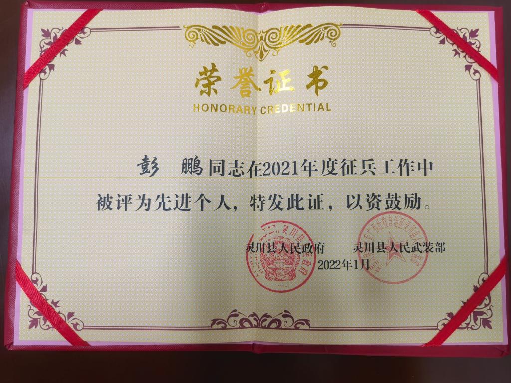 1月7日上午,灵川县人民政府征兵办公室在县行政大楼召开了2022年春季征兵工作部署会议,会议宣读了灵川县2021年度征兵工作先进集体和个人名单。pp电子征兵工作站被评为“灵川县2021年度征兵工作先进单位”,学校武装部部长彭鹏老师被评为“灵川县2021年度征兵工作先进个人”。