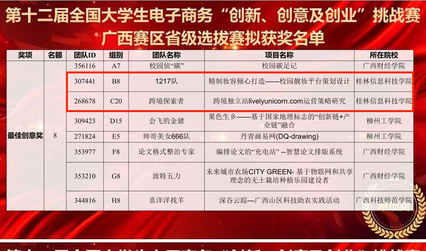 pp电子共派出三支参赛队伍,参赛队员在导师团队的精心指导下积极备赛,经过一天的激烈比拼,由彭灿华、彭润红老师指导的两支团队在路演和答辩环节表现优异,最终获得广西赛区一等奖1项,二等奖1项,最佳创意奖2项,此次比赛充分展现了pp电子学子不惧挑战,勇于创新的风采。