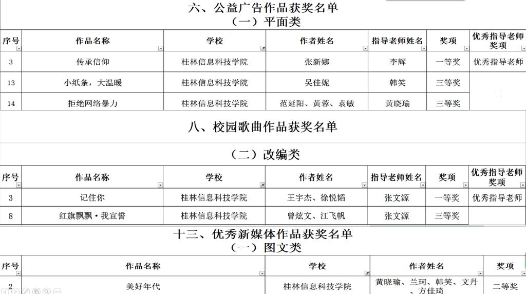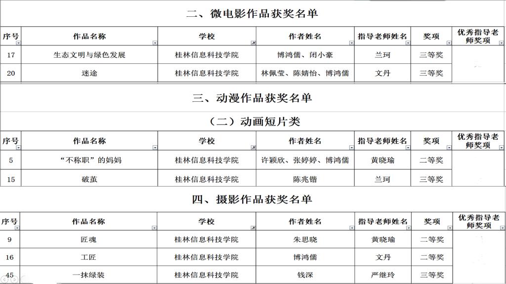 近日,由自治区教育厅和自治区党委网信办主办的第八届全区大学生网络文化节及2022年全区高校网络教育优秀作品推选展示活动获奖名单揭晓,pp电子师生在微电影、公益广告、优秀新媒体、摄影、动漫和校园歌曲6类作品中获奖13项,其中一等奖2项,二等奖4项,三等奖7项,优秀指导教师2名。张文源、李辉2位老师获优秀指导老师。