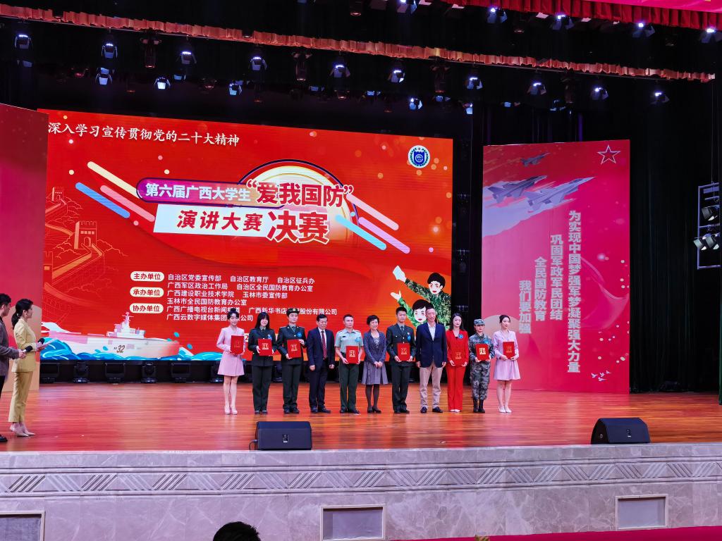 本次比赛以“新时代爱国强军谱新篇”为主题,通过参赛选手的激情演绎,进一步增强我区广大青年学子赓续红色血脉、矢志强军兴国的爱国热情。在决赛中,刘湘玉同学以《清澈的爱,只为中国》为题,分享自身服役期间的难忘经历,充分展现了一名新时代大学生心系国防,强国有我的动人风采,赢得了现场观众的阵阵掌声。赛后,主办方组织各获奖选手赴玉林市开展国防体验活动,还将分赴桂林电子科技大学、广西培贤国际职业学院等5所高校开展巡讲。