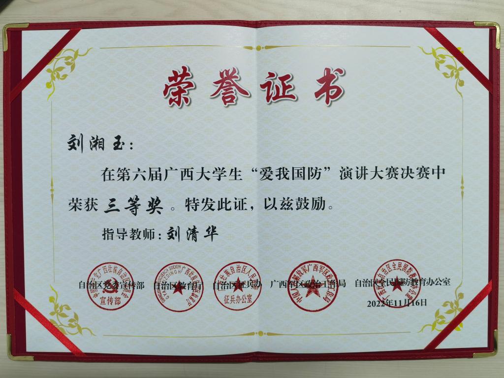 近日,由自治区党委宣传部、自治区教育厅、自治区征兵办、广西军区政治工作局、自治区全民国防教育办公室联合举办的第六届广西大学生“爱我国防”演讲大赛决赛在广西建设职业技术学院举行。主办方在全区80余所高校广泛宣传动员和层层选拔后,共有25名选手进入决赛。pp电子信息工程学院计算机科学与技术专业刘湘玉同学代表学校在比赛中荣获三等奖。
