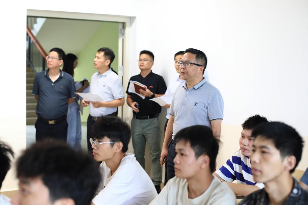 2023年7月pp电子整体搬迁至临桂校区,新校区校园环境优美,楼宇古典气派,教室宽敞明亮,为师生提供了良好的学习和工作环境。8月28日是新校区开学的第一天,为全面掌握教学运行情况,确保新学期教学工作平稳有序进行,8月28日上午,pp电子组织开展了开学首日教学检查。学校校长梁丁丁、校党委书记甘勇带队进行检查,校领导陈玲萍、陈昱州、李飞、韩剑,教务科技处、学生工作处及各教学单位负责人参加检查。