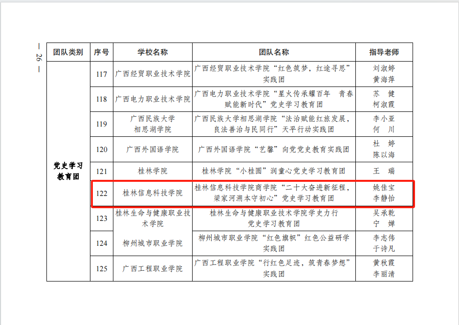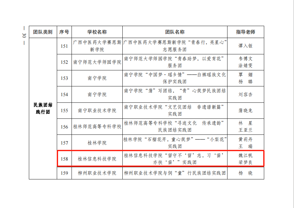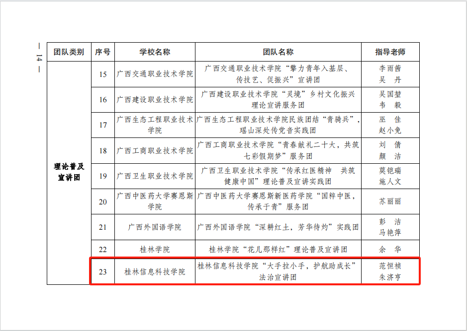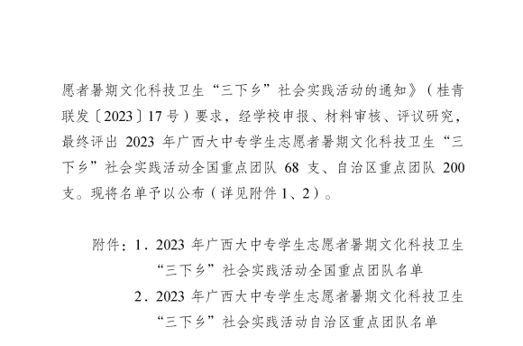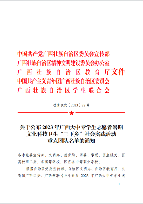 近日,根据自治区教育厅、共青团广西区委等部门共同印发的《关于公布2023年广西大中专学生志愿者暑期文化科技卫生“三下乡”社会实践活动重点团队名单的通知》(桂青联发〔2023〕28号),本年度学校共有3支团队荣获自治区“三下乡”社会实践重点团队,分别是学校电子工程学院“大手拉小手,护航助成长”法治宣讲团、商学院“二十大奋进新征程,梁家河溯本守初心”党史学习教育团、信息工程学院“留守不‘留’志,习‘苗’亦扶‘苗’”实践团。