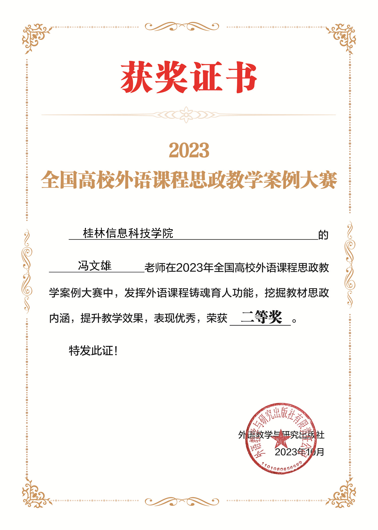 10月8日,由外语与教学研究出版社举办的2023年全国高校外语课程思政教学案例大赛获奖名单公示,pp电子外贸与外语学院教师冯文雄的参赛作品《商务英语翻译II:经济类文本的汉英翻译》荣获二等奖。