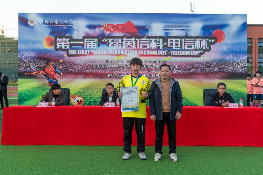 在比赛现场,学校校长助理韩剑和本次比赛独家赞助商桂林市湘婷通讯有限公司总经理覃军来到现场观赛,共同见证了这场足球盛宴。比赛结束后,举行了隆重的颁奖仪式,本次比赛设立了金靴、银靴及金手套奖等个人奖项,以表彰在赛场上表现突出的运动员。金靴奖得主是来自商学院一队的优秀前锋朱冠璋,在本次比赛中他以攻入28球的总进球数“傲绝群雄”,成为最佳射手;银靴奖则由商学院的黄奕森和外贸与外语学院的翟煜博共同获得。金手套奖颁给了商学院一队的主力门将童康铭,他在比赛中多次化解对方极具威胁的进攻,成为球队夺冠的关键人物。