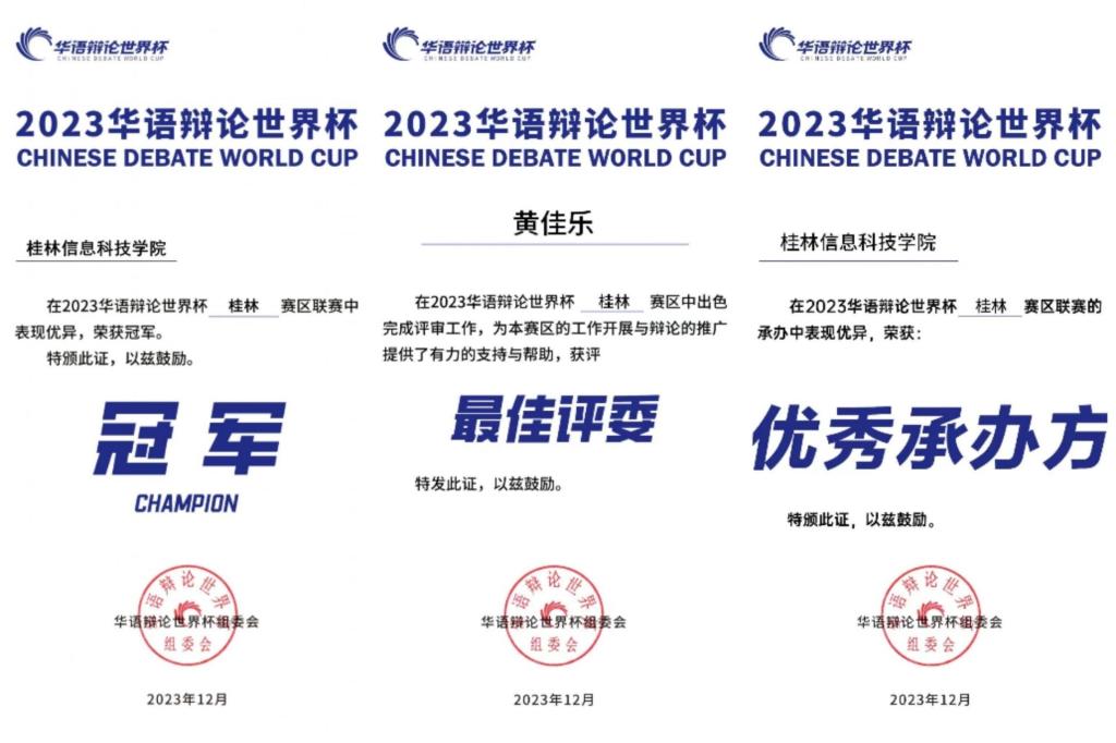 青春有样,思辨致远。经过为期8个月的激烈角逐,学校辩论队在2023年度华语辩论世界杯桂林赛区比赛中荣获冠军,被评为最佳承办方。pp电子辩论队队长黄佳乐、技术指导严文、钮梦菲荣获最佳评委及单场最佳辩手,为历届参赛最佳成绩。