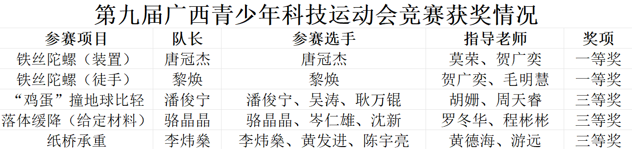 11月23-24日,由广西壮族自治区教育厅、广西壮族自治区科学技术协会主办,广西师范大学科学教育研究所、广西壮族自治区科学技术馆广西大学承办的第九届广西青少年科技运动会在南宁第三中学青秀校区成功举办,本次大赛设置了水火箭比高、铁丝陀螺比久、纸桥承重等八大项目。经过校内选拔赛的层层选拔,共有10支队伍从120余支报名队伍中脱颖而出,代表学校参加本届比赛。