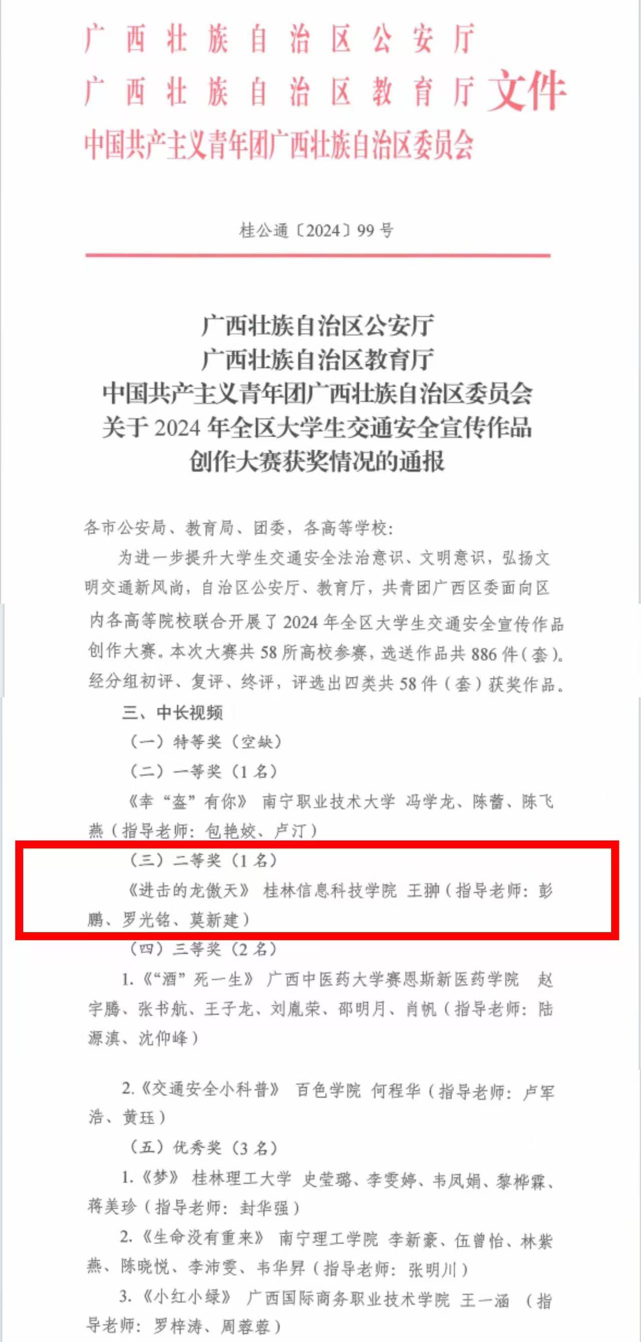 近日,由自治区公安厅、自治区教育厅、共青团广西区委联合组织开展——2024年全区大学生交通安全宣传作品创作大赛活动圆满结束,pp电子参赛团队积极响应,通过分析校园交通安全现状,结合大学生群体的特点和需求,创作的交通安全宣传视频《进击的龙傲天》,在此次比赛中脱颖而出,荣获大赛二等奖。