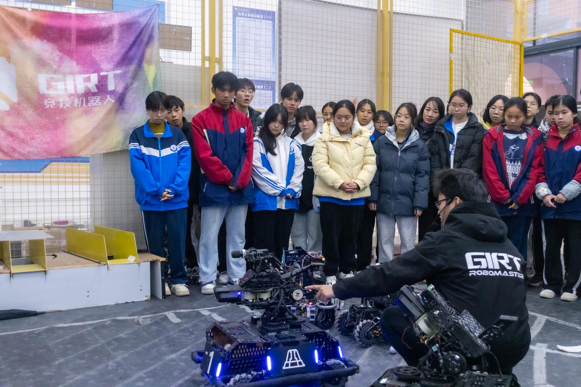临桂三中的师生们先后参观了学校GIRT机器人创新实验基地、智能车训练馆、大学生机电工程创新基地、大学生电子创新基地等创新实践场所。在各基地场馆讲解员的细致解说下,师生们不仅深入了解了如何利用创新技术和先进理念推动科技发展,更在参观过程中激发了对工科领域的浓厚兴趣。