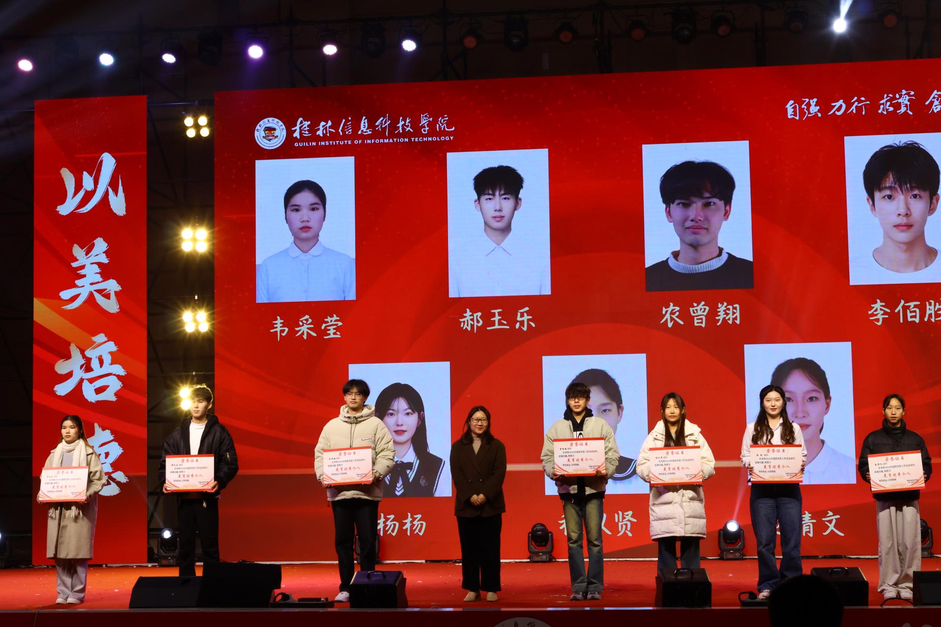 晚会特别表彰了荣获广西第七届大学生艺术展演活动艺术表演类一等奖的杰出作品《密码》与《你的心愿》以及学校2024年度美育领域表现突出的“美育优秀个人”。