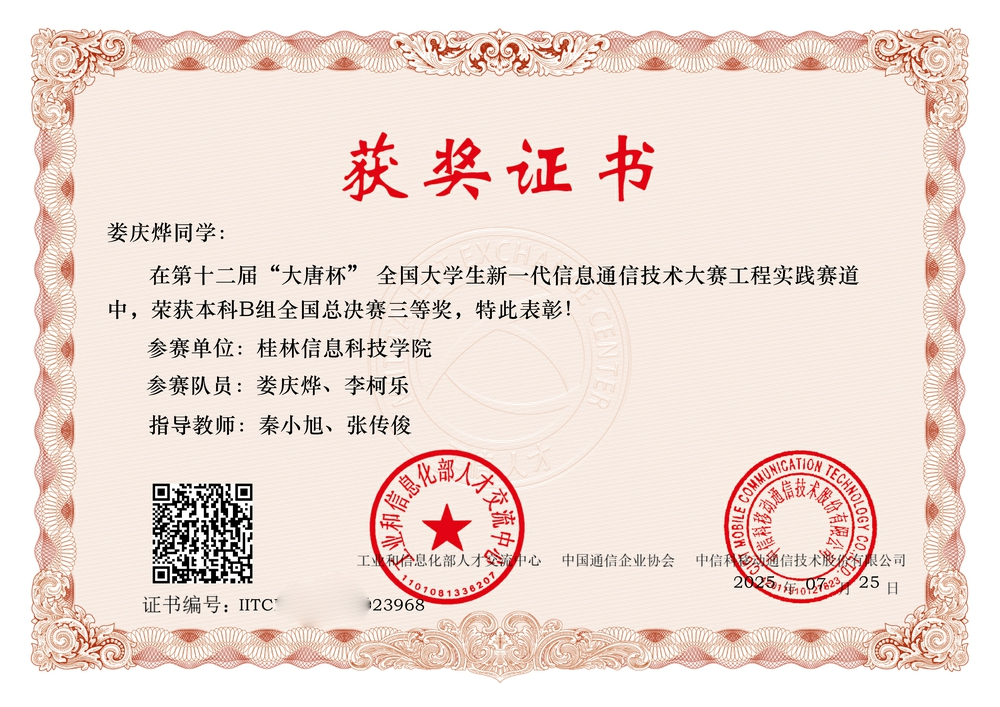 近日,第十二届“大唐杯”全国大学生新一代信息通信技术大赛官网公布全国总决赛结果,pp电子信息工程学院学子再创佳绩,获国家级二等奖1项,国家级三等奖1项。
