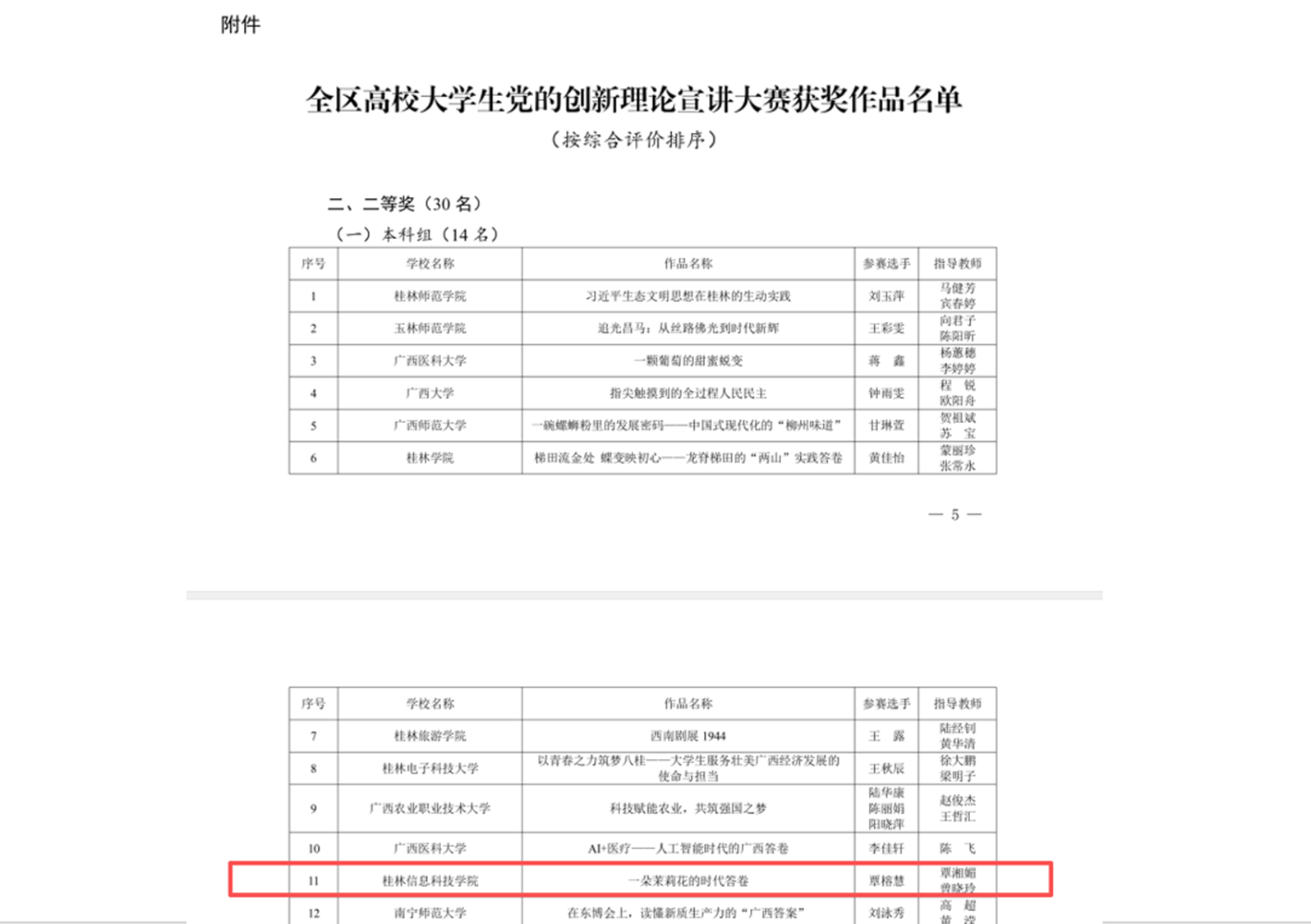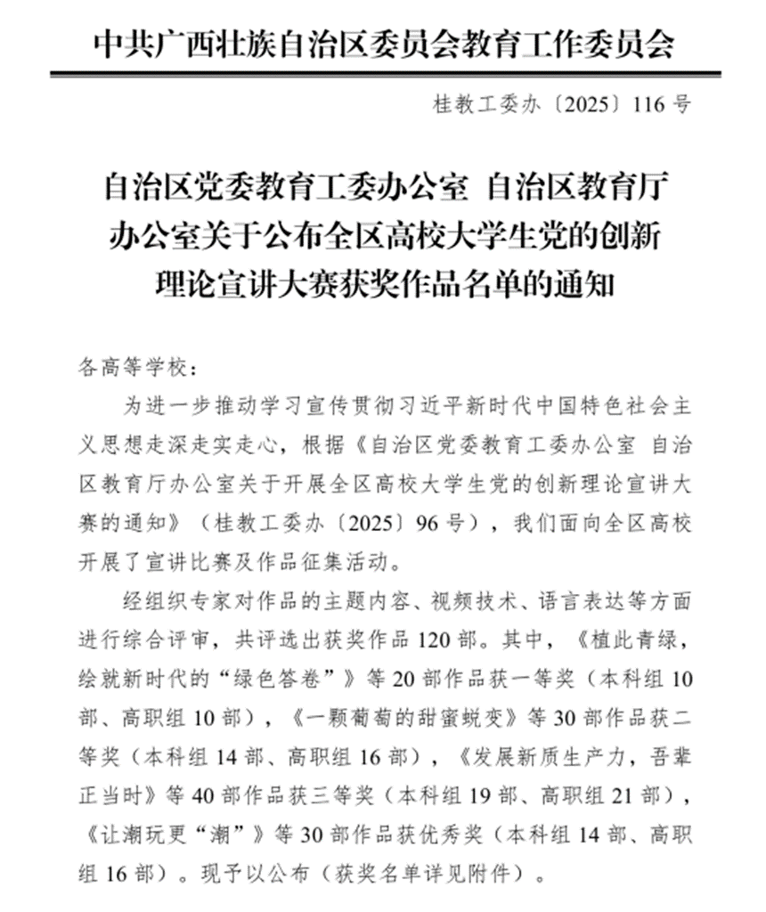 近日,自治区教育厅办公室公布2025年全区高校大学生党的创新理论宣讲大赛获奖名单,pp电子学子喜获佳绩:覃榕慧同学作品《一朵茉莉花的时代答卷》(指导老师:信息工程学院覃湘媚、曾晓玲)荣获二等奖;刘浩宇同学作品《以“人民至上”照亮教育之路》(指导老师:马克思主义学院剌啸媛、赵奕)荣获三等奖。