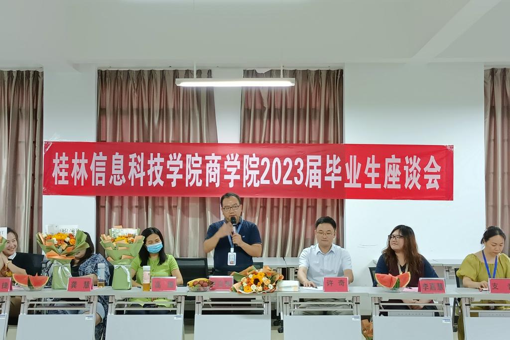 6月19日中午,商学院在52502教室举办2023届毕业生代表座谈会,共话信科学习生活的感悟收获,畅谈人生未来的发展规划。学院副院长罗志明、党委书记许奇,各教研室教师代表、毕业生辅导员以及优秀毕业生代表参加此次座谈。会议由学院学工办主任肖玲主持。
