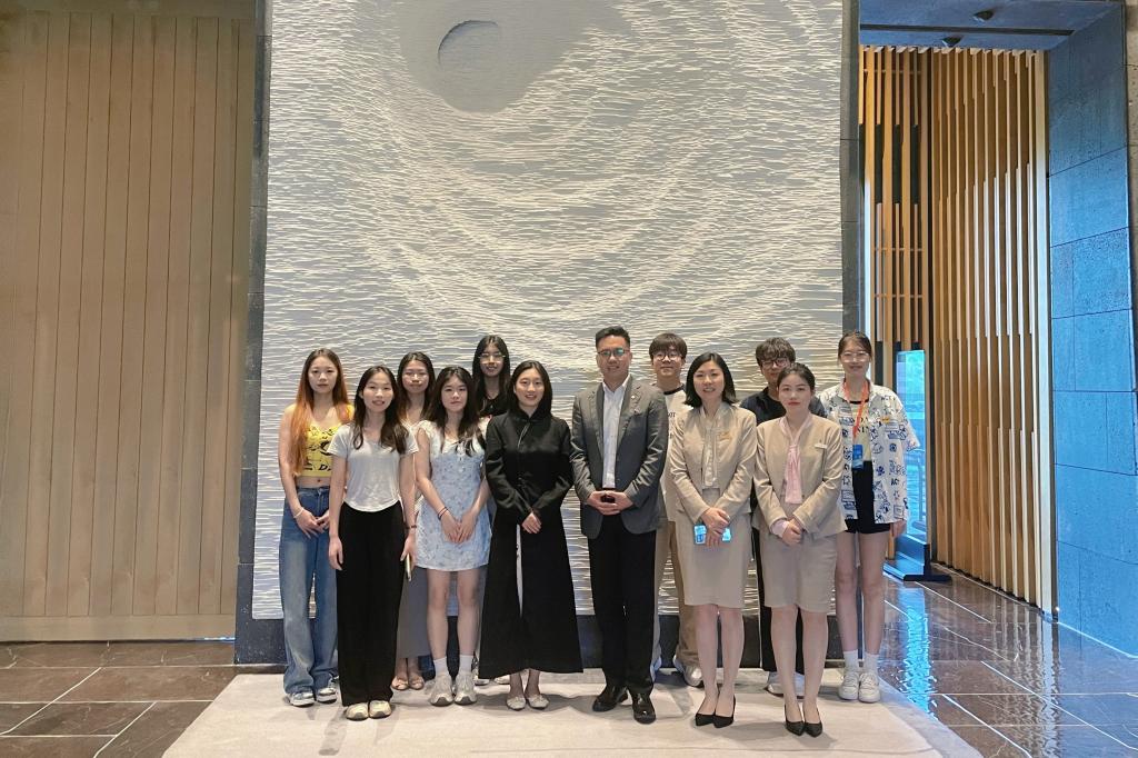 5月27日,外贸与外语学院商务英语专业教研室副主任闵世琦前往朗庭酒店集团旗下宁波东钱湖康得思酒店走访调研,2022级商务英语和2021级国际商务等专业的8名同学参与本次调研活动。酒店总经理郁琪、人力资源总监部李媛和招聘部经理林晴晴等对闵老师及学生们的到访表示了热烈的欢迎。