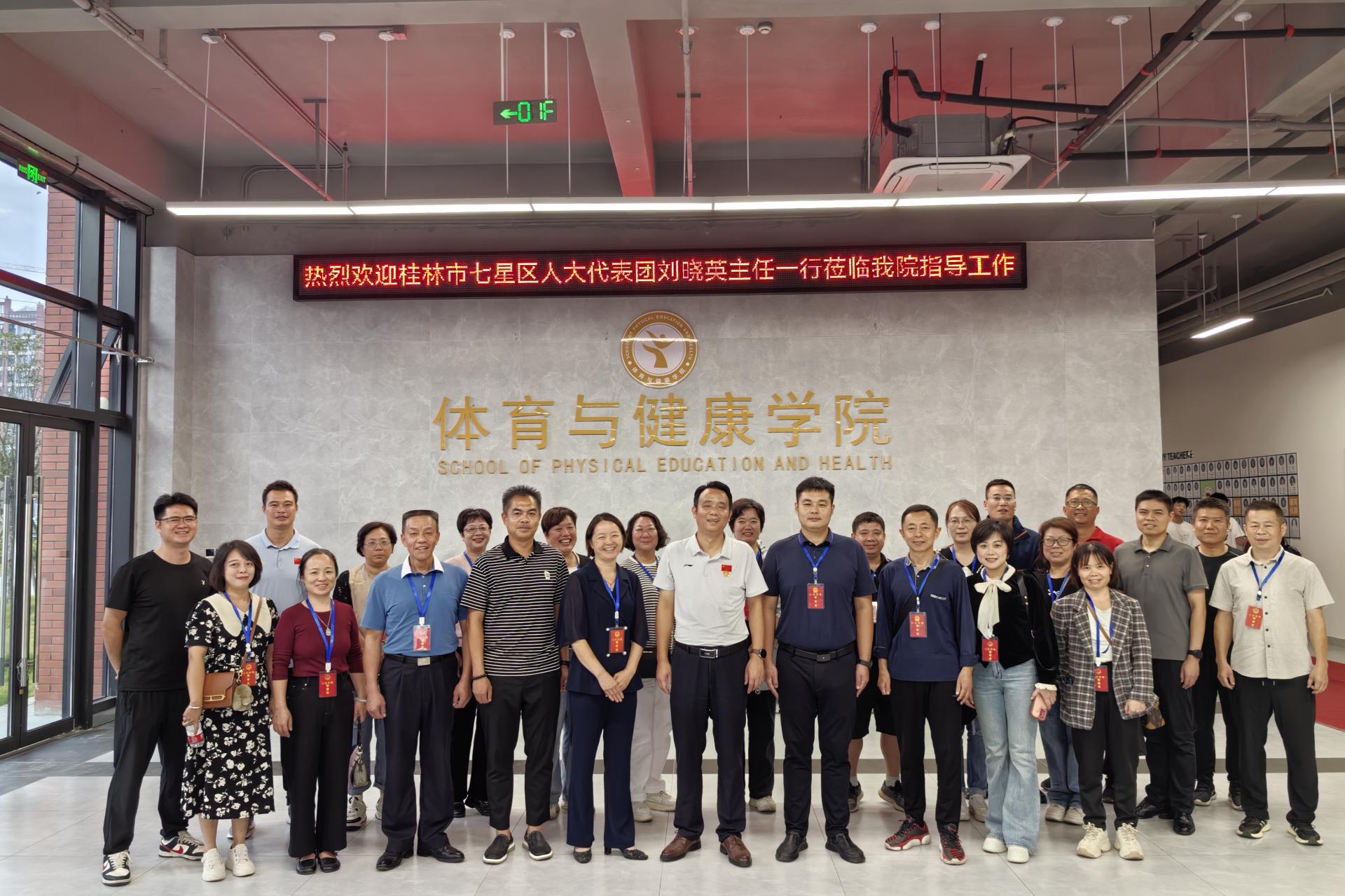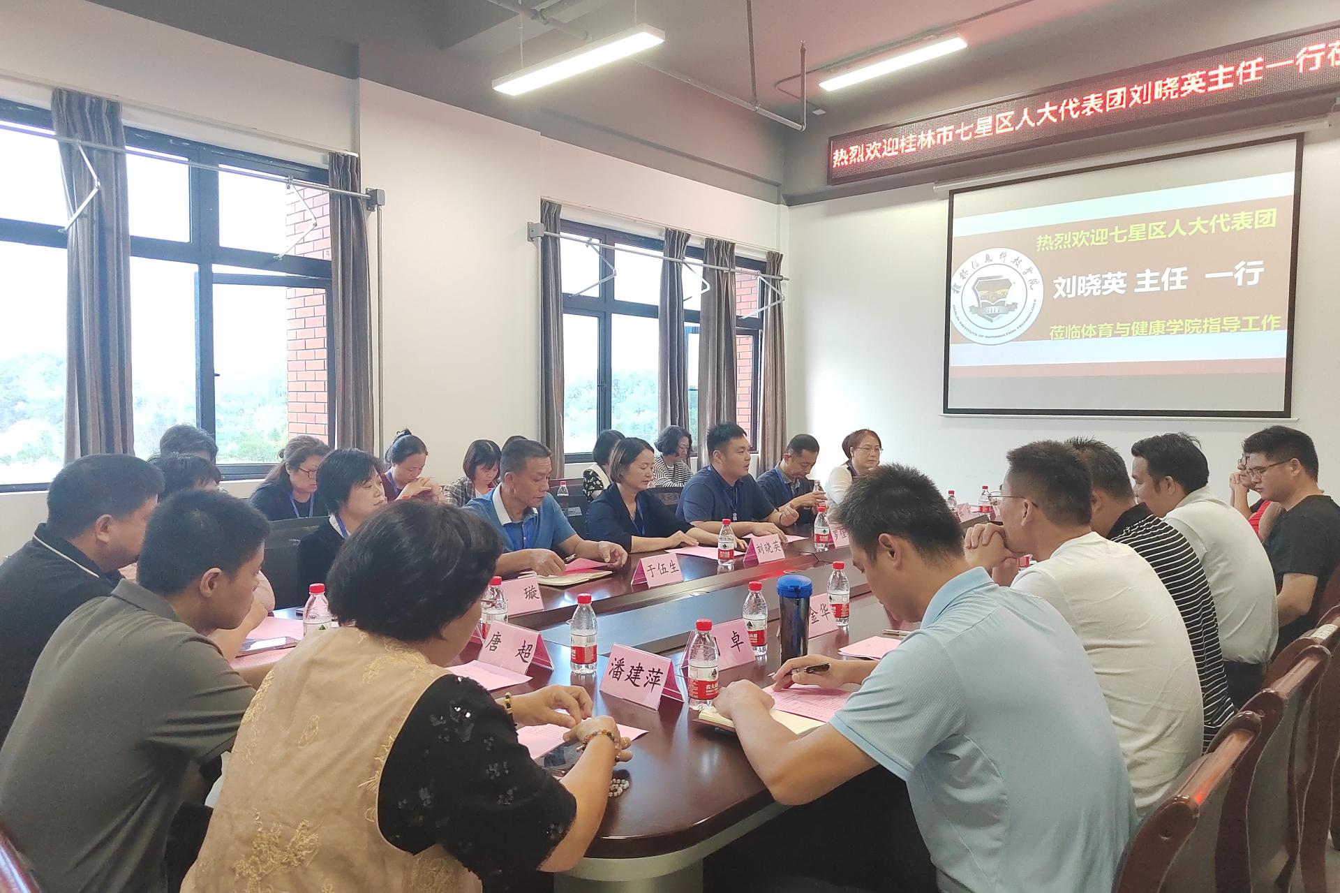 10月16日下午,桂林市七星区人大常委会选联工委主任刘晓英、七星区东江街道党工委书记罗佳荣等领导率团来体育与健康学院进行调研合作交流,会议由体育与健康学院院长周勇主持,体育与健康学院党总支书记关永康、各教研室主任、院办、学工以及教师代表共计30余人在行健楼205会议室参加了此次会议。