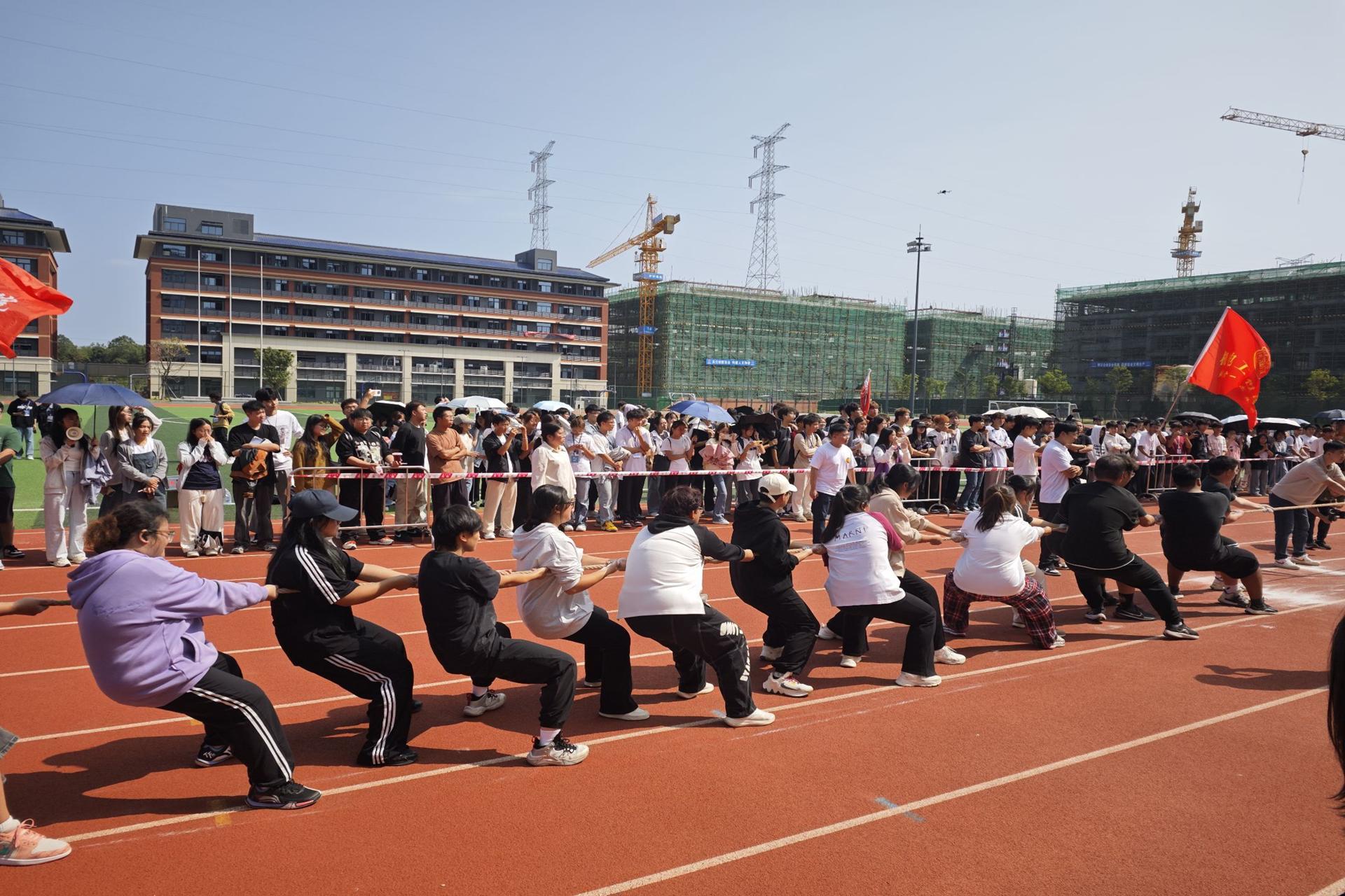 随着裁判的一声哨响,信息工程学院与机电工程学院的队伍迅速进入状态。他们紧握长绳,脚踏实地,仿佛要将每一分力量都凝聚在这根绳子上。在双方队员的激烈对抗中,红绸带缓缓移动,每一次微小的偏移都牵动着观众的心弦。最终,凭借着我院队员们的默契配合和顽强拼搏,在经过几轮激烈的拉锯战,信息工程学院终于赢得了比赛的胜利。