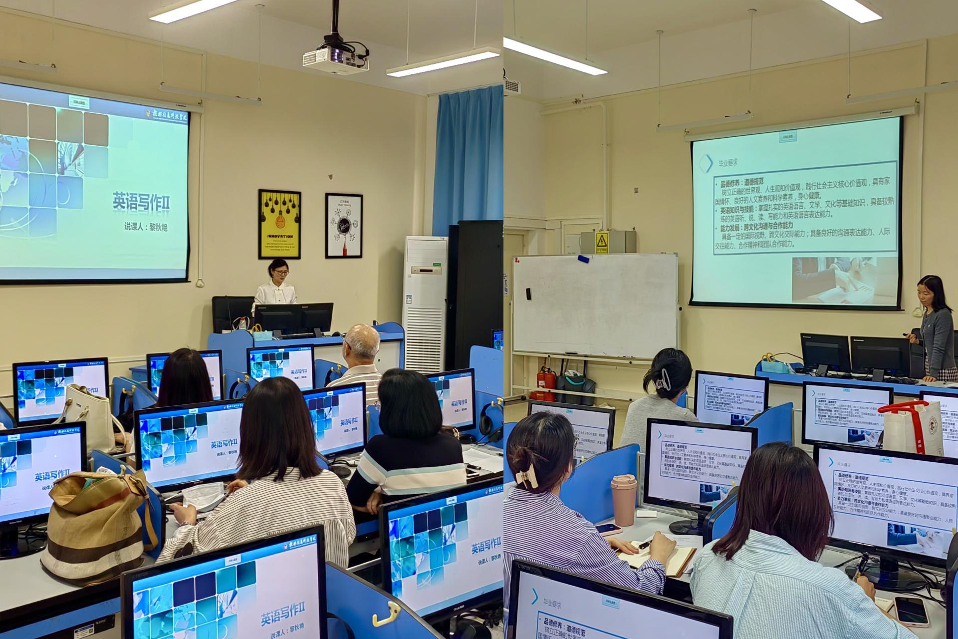 活动中,黎秋艳老师首先从课程概括、教学理念、课程设置以及教学实施等多个方面,深入浅出地阐述了《英语写作II》课程的教学设计与实施方法。随后,唐清华老师从课程设置、教学特色以及课程资源等角度对《综合英语III》展开阐述,并选择部分课程内容作为Domeclass进行展示。两位老师的说课内容详实、逻辑清晰,充分展示她们在教学设计上的深厚功底与创新精神。