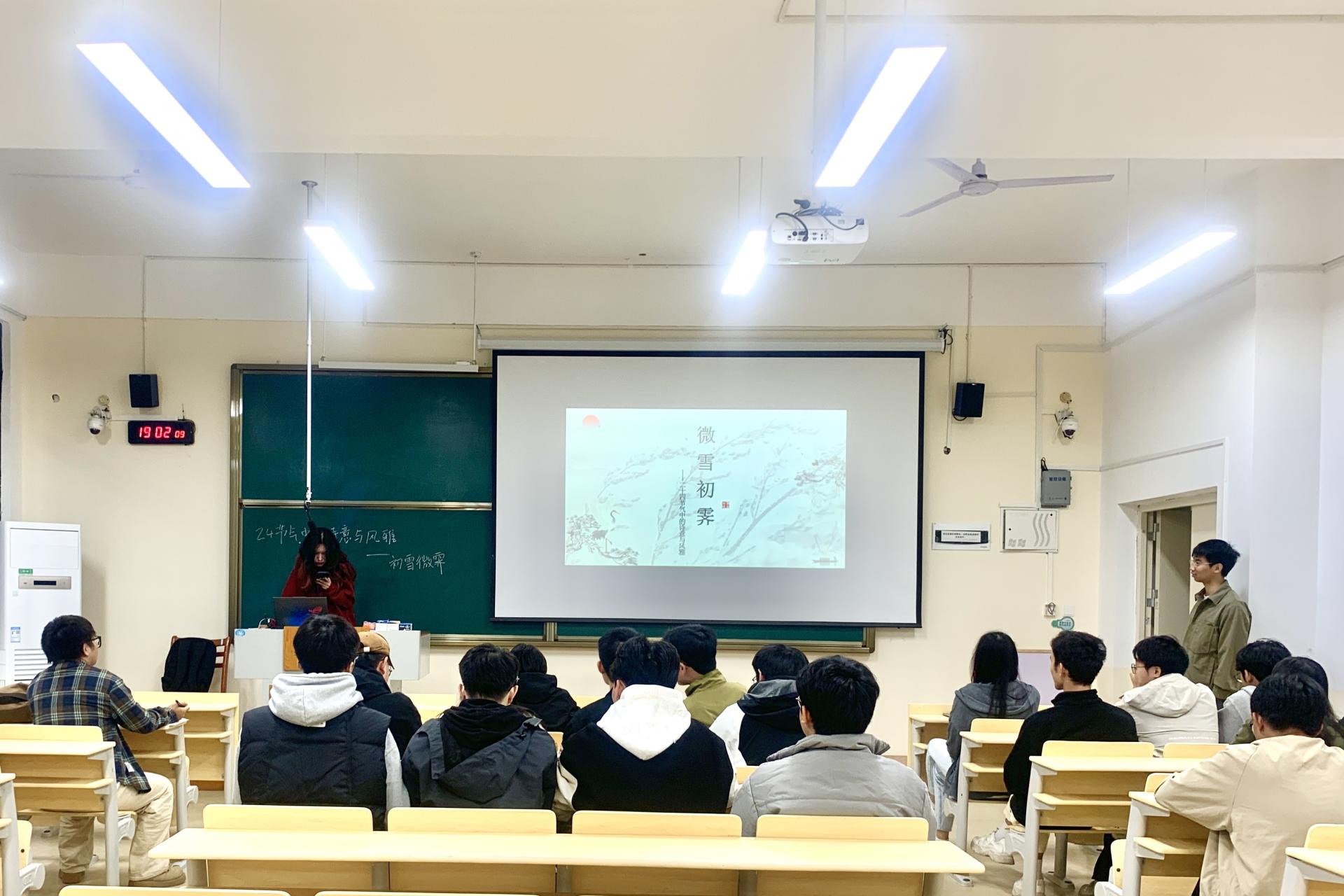 为了让广大学生熟悉二十四节气,深刻体会中国古人对自然规律的精妙洞察与和谐共生的哲学思想,感受中国传统文化的魅力,11月19日晚,图书馆读书协会在D108教室开展以“二十四节气中的诗意与风雅—微雪初霁”为主题的读书分享活动。本次活动由读书协会讲师团成员翟梓萱主持,协会指导老师机电工程学院辅导员于凌浩老师参加了活动。